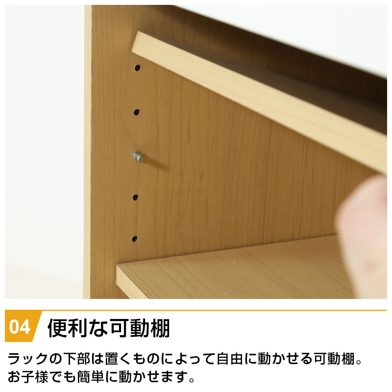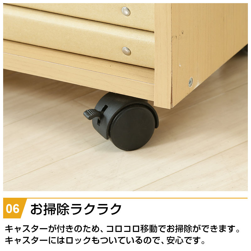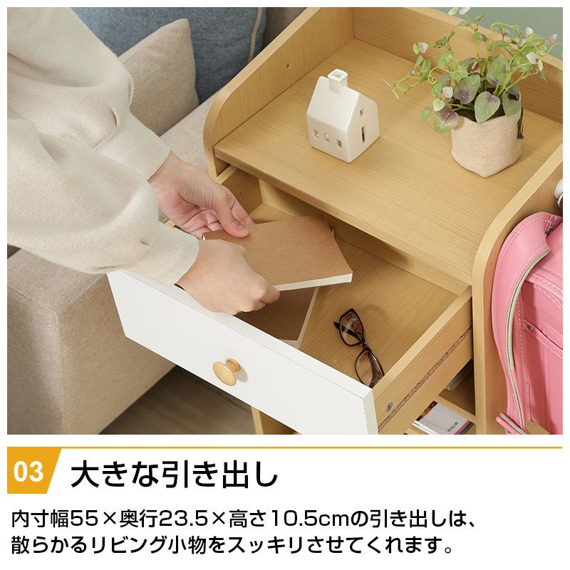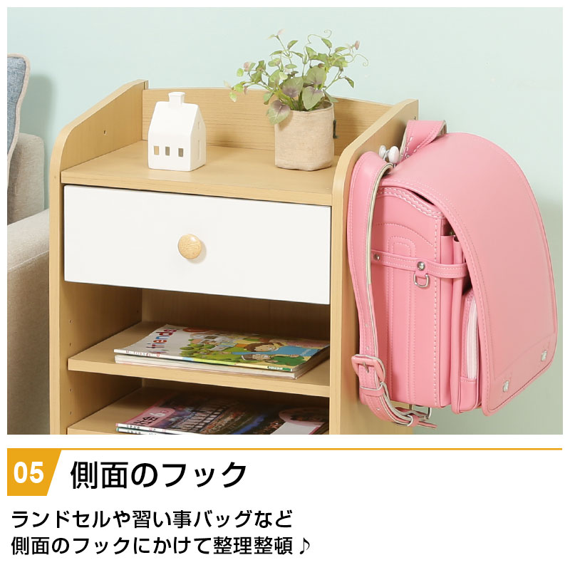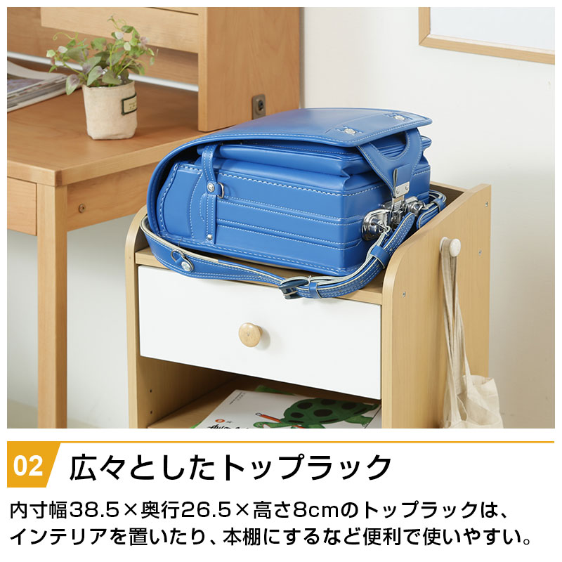 | 特徴 | ・ナチュラル色で大きくなっても使えるデザイン ・広々としたトップラックは本棚としても使える ・大きい引出しは小物や洋服などをすっきり収納 ・ラックの下部は置くものによって自由に動かせる可動棚 ・ランドセルや習い事バッグなど側面のフックにかけて整理整頓 ・キャスター付きだからお掃除ラクラク |