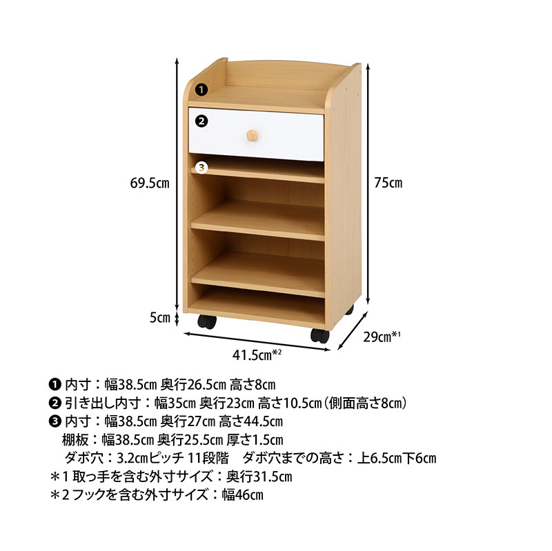 | サイズ(cm) | 幅41.5×奥行29×高さ75 耐荷重(全体):20kg 耐荷重(棚板):5kg 引出内寸:幅35×奥行23×高さ10.5(8) |