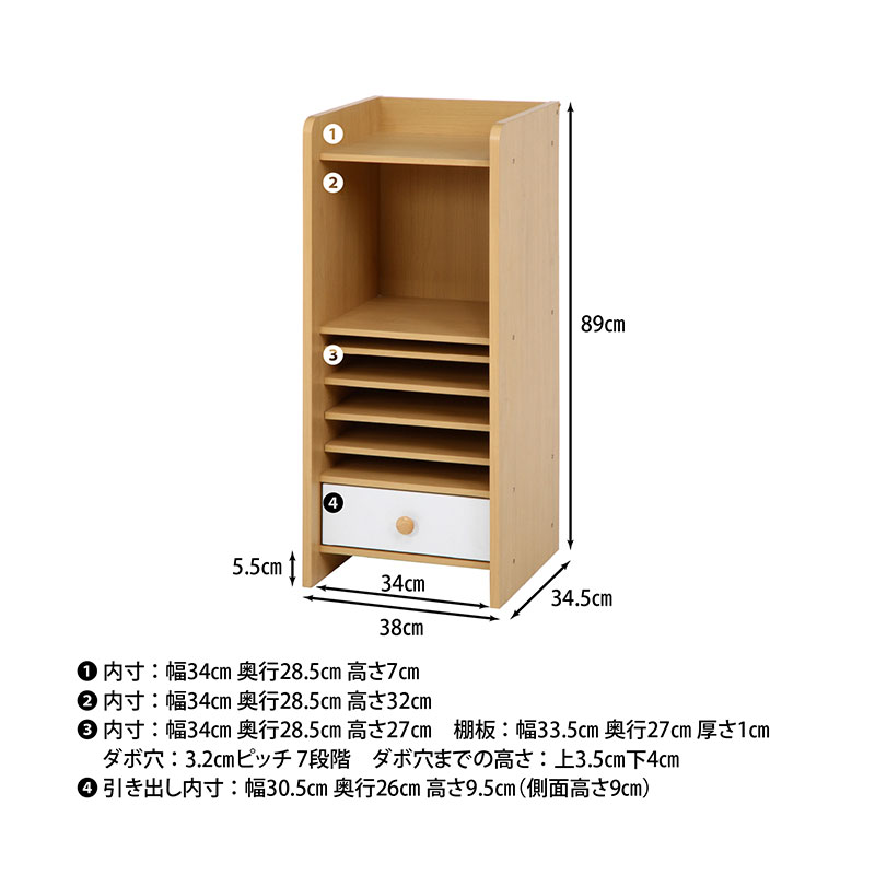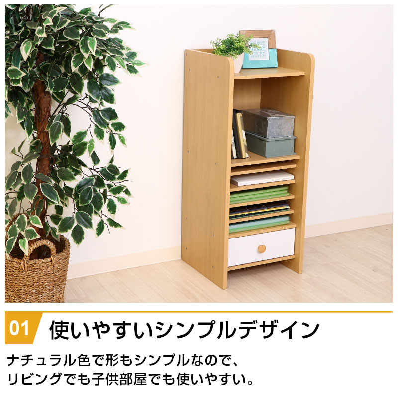 ■カラー ナチュラル ■サイズ(cm) 幅38×奥行34.5×高さ89 耐荷重(全体):20kg 引出内寸:30.5×26×9.5 ■重量 14kg ■材質 表面材:プリント紙化粧繊維板 実物に近い状態で撮影していますが、撮影時の光の加減やお客様のPC設定により若干の色合いが異なる場合がございます。 曲線部分や若干の個体差により、多少の誤差が生じることがございます。予めご了承ください。 【送料無料】 ただし、北海道・沖縄・離島は追加送料が必要となります。 ※追加料金が必要な場合、買い物カゴでは再計算されません。料金確定後、こちらからご連絡させていただきます。 【キーワード】 ラック 本棚 小学生 レッスンバッグ 子供部屋 教科書 入学 入園 準備 高さ調節 子供用 ベビー ベビー服 オムツ 赤ちゃん 誕生日 プレゼント ギフト リビング ランドセル収納 収納ワゴン おもちゃ収納 キッズ収納