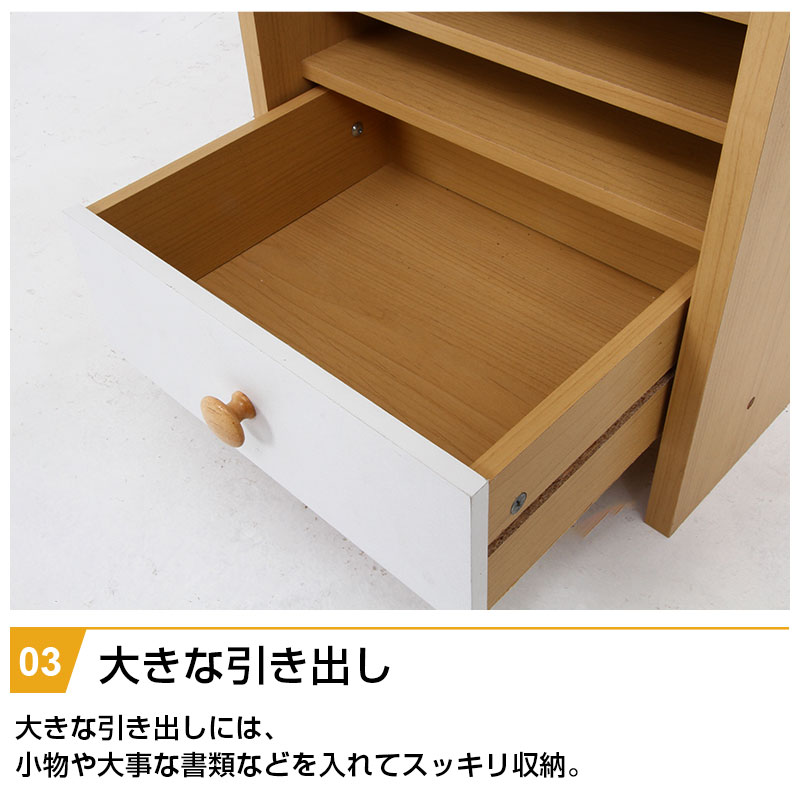 | 特徴 | ・ナチュラル色で大きくなっても使えるデザイン ・広々としたトップラックは本棚としても使える ・大きい引出しは小物や洋服などをすっきり収納 ・ラックの下部は置くものによって自由に動かせる可動棚 |