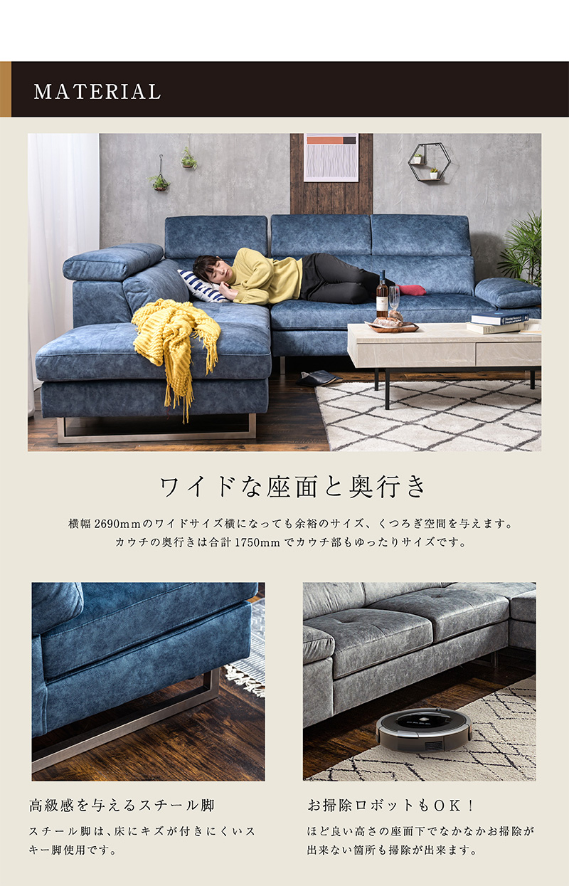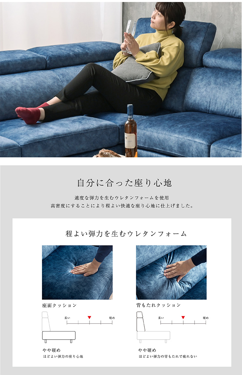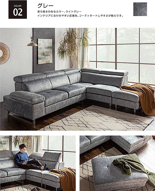 | 特徴 | ハイバック対応のコーナーカウチ。濃淡を生かしたスウェード調の生地 人気の新素材スムーステックを使用したカウチソファーです。 ヘッドレスト、アーム部分は可変ギア仕様でハイバックやローバックに対応。 脚を取ればローソフアにもなる 座面内部はウレタンフォーム、S字スプリング、ウェービングベルトで長時間座っても 疲れにくく快適な座り心地です。 好みや状況に合わせて可動できるので、ダイニングからの視界を妨げる事もありません。 |