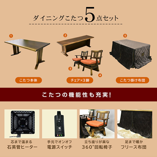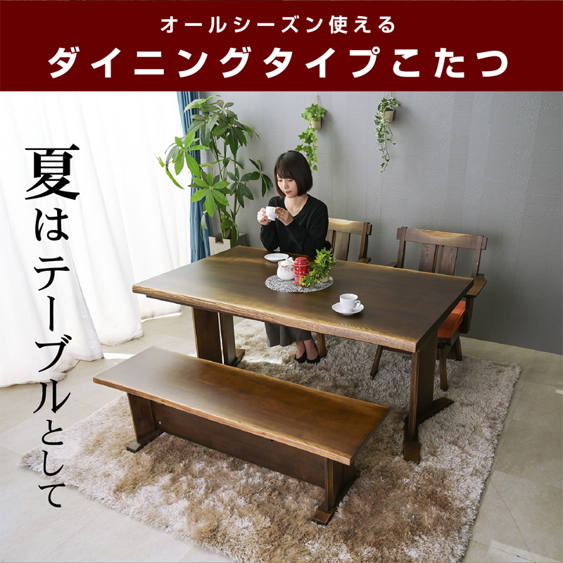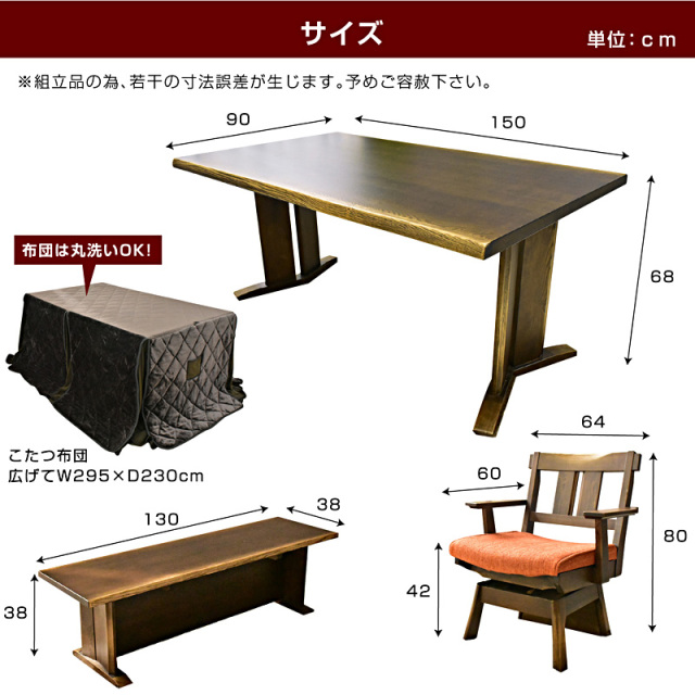 | サイズ(cm) | 【テーブル】幅150×奥90×高68 【チェア】回転いす:幅64×奥60×高80(SH42) 【ベンチ】幅130×奥38×高38 【こたつ掛け布団】約295×約230 |