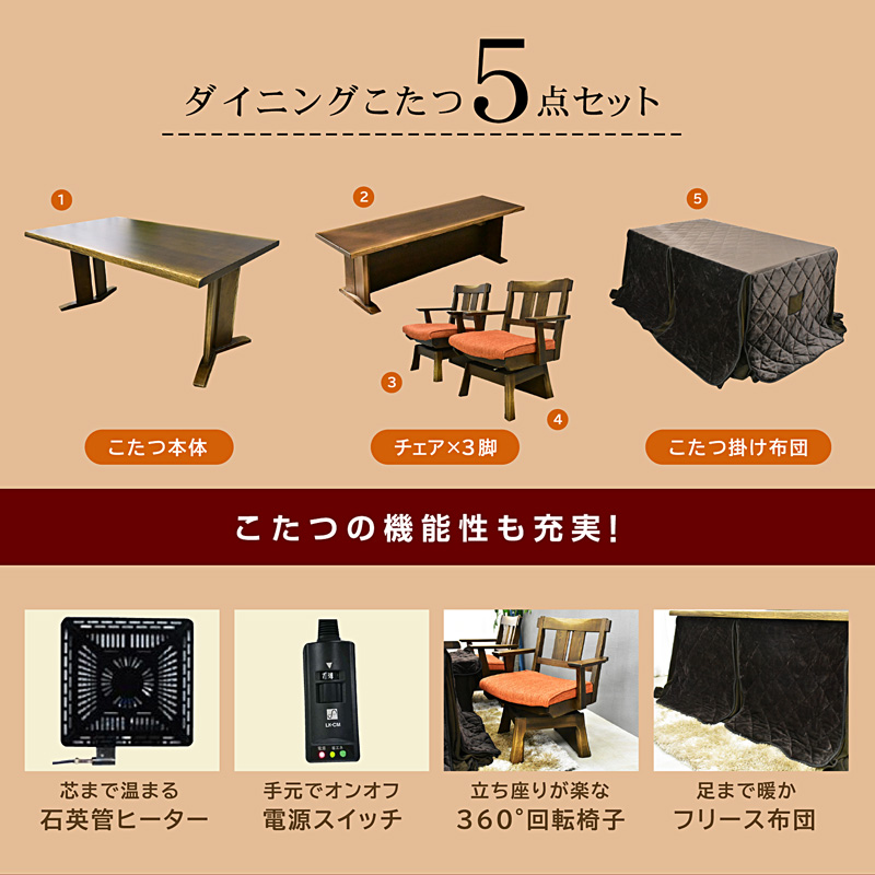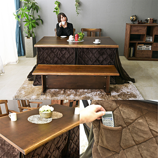 | 材質・仕様 | 【テーブル】本体:タモ突板・タモ無垢 (ダークブラウン) 【チェア】タモ無垢 座面ファブリック 【こたつ掛け布団】裏面ボア生地 (ダークブラウン) |