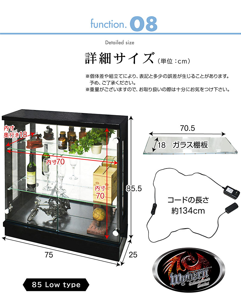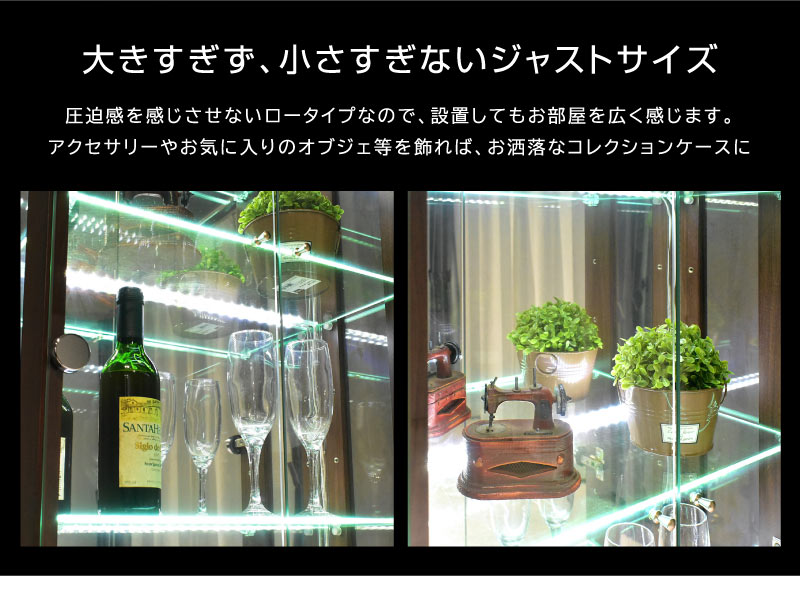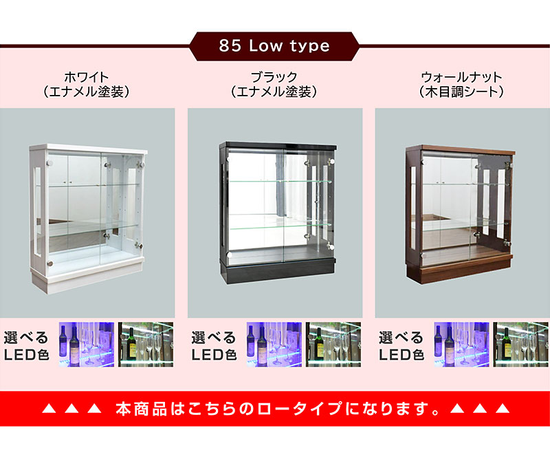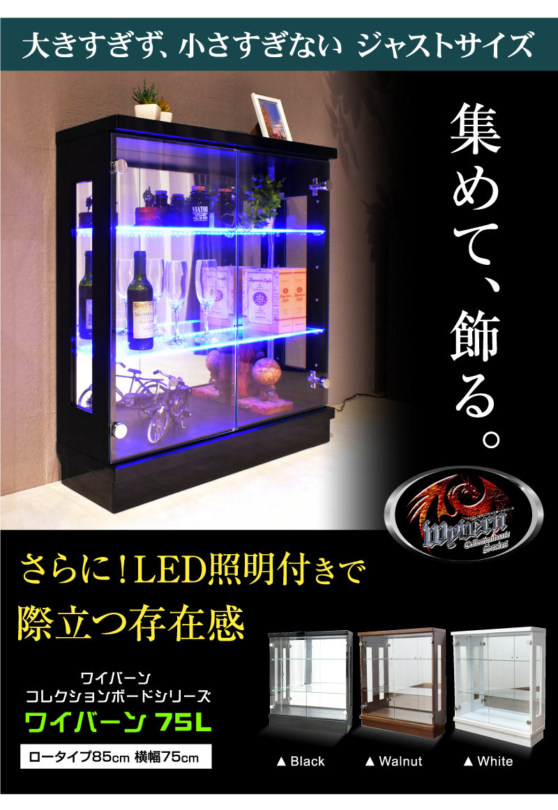 ■カラー ホワイト・ブラック・ウォールナット ■サイズ 幅75×奥25×高さ85.5cm ■素材 ブラック色・ホワイト色:エナメル塗装 ウォールナット色:木目調シートの強化シート ■特徴 【ほぼ完成品】 ・センスのいいスタイリッシュなコレクションボード ・大切なコレクションを優雅に美しく演出 ・お部屋のテイストに合わせやすい3カラー対応です ・ミラー張りの背面で空間を引き立てるコレクションボードです ・ロータイプで収納力抜群 ・2枚のガラス棚板付き 9cmピッチで6段階高さ調節可能 ・LEDライトが、ブルーまたはホワイトの2色からお選び頂けます ■送料 送料無料 ただし、北海道・東北地方は追加の料金が必要となります。(沖縄・離島は別途お見積り) また、開梱設置サービスをご利用の場合、送料とは別に料金が必要です。 ご注文前にお問い合せください。 ※追加料金が必要な場合、買い物カゴでは再計算されません 料金確定後、こちらからご連絡させていただきます。