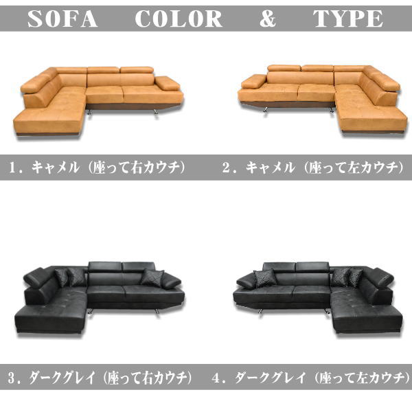 素材 新素材ファブリック ウレタンフォーム S字スプリング スチール脚 サイズ 全体:幅260×高さ79-93×奥行185(cm) 座面高さ48(cm) 2Pのみ:幅175×高さ79-93×奥行84(cm) 座面高さ48(cm) カウチのみ:幅85×高さ79-93×奥行185(cm) 座面高さ48(cm) 特徴 キャメル色とダークブラウン色の快適カウチソファです。 背もたれ上部にはお好みの角度に調整して使えます。 右肘掛け、ヘッドレストはギア式リクライニングが付いており機能的です。 (カウチソファの角のヘッドレストは可動しません。) 張地には新素材ファブリックを使用しており手触りも良く高級感も御座います。 座面の内部にはウレタンフォーム+S字スプリング入りでしっかりとした反発力のある快適な掛け心地 クロスステッチ入りのお洒落なクッション3個がセットになっております。 脚部はお洒落なスチール脚で取り外してご使用できます。 送料無料 ただし、北海道・東北地方は追加の料金が必要となります。(沖縄・離島は別途お見積り) ※追加料金が必要な場合、買い物カゴでは再計算されません。料金確定後、こちらからご連絡させていただきます。