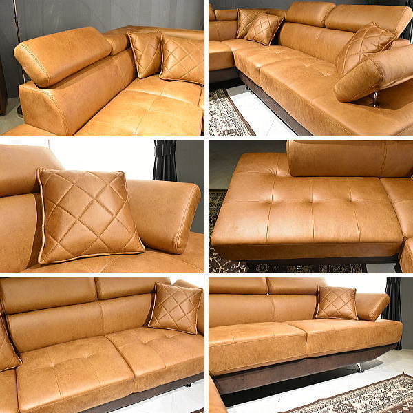 | 特徴 | キャメル色とダークブラウン色の快適カウチソファです。 背もたれ上部にはお好みの角度に調整して使えます。 右肘掛け、ヘッドレストはギア式リクライニングが付いており機能的です。 (カウチソファの角のヘッドレストは可動しません。) 張地には新素材ファブリックを使用しており手触りも良く高級感も御座います。 座面の内部にはウレタンフォーム+S字スプリング入りでしっかりとした反発力のある快適な掛け心地 クロスステッチ入りのお洒落なクッション3個がセットになっております。 脚部はお洒落なスチール脚で取り外してご使用できます。 |