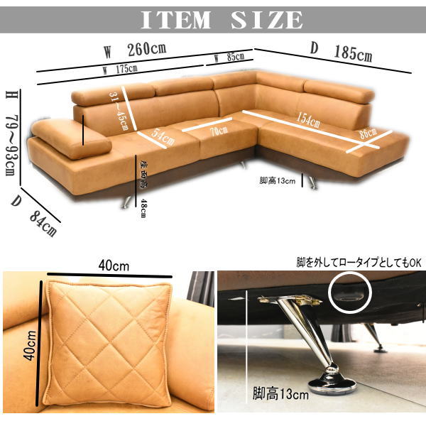 全体:幅260×高さ79-93×奥行185(cm) 座面高さ48(cm) 2Pのみ:幅175×高さ79-93×奥行84(cm) 座面高さ48(cm) カウチのみ:幅85×高さ79-93×奥行185(cm) 座面高さ48(cm) |