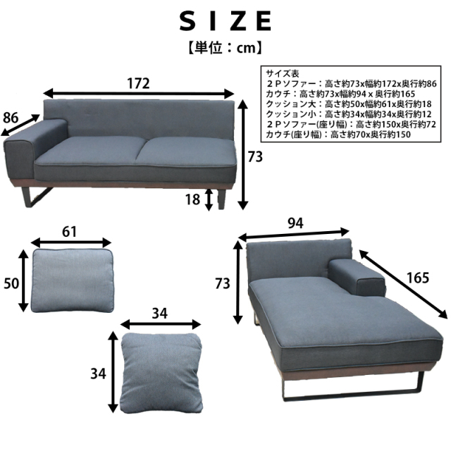 【商品サイズ】 2Pソファー:幅172×高さ73×奥行86(cm) カウチ:幅94×高さ73×奥行165(cm) クッション大:幅61×高さ50×奥行18(cm) クッション小:幅34×高さ34×奥行12(cm) 2Pソファー(座り幅):高さ150×奥行72(cm) カウチ(座り幅):高さ70×奥行150(cm) 【梱包サイズ】 幅173×高さ58×奥行90(cm) 幅95×高さ60×奥行165(cm) |
