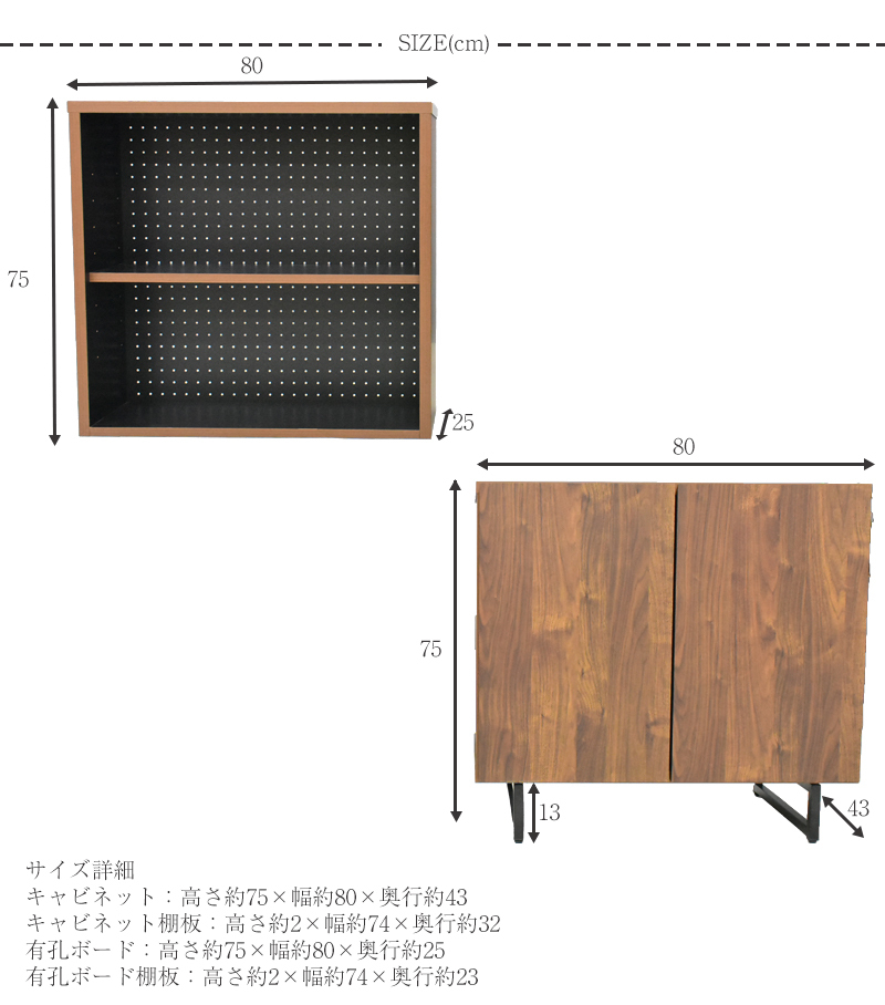 【商品サイズ】 キャビネット:高さ約75×幅約80×奥行約43 キャビネット棚板:高さ約2×幅約74×奥行約32 有孔ボード:高さ約75×幅約80×奥行約25 有孔ボード棚板:高さ約2×幅約74×奥行約23 【梱包サイズ】 2個口 高さ約62×幅約81×奥行約44 高さ約76×幅約81×奥行約26 |