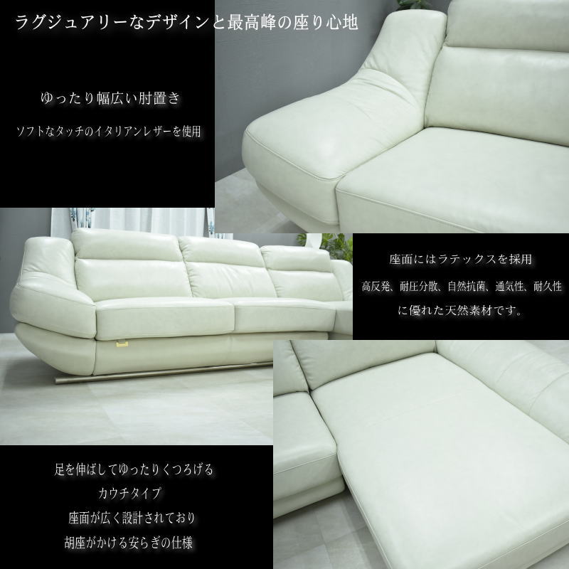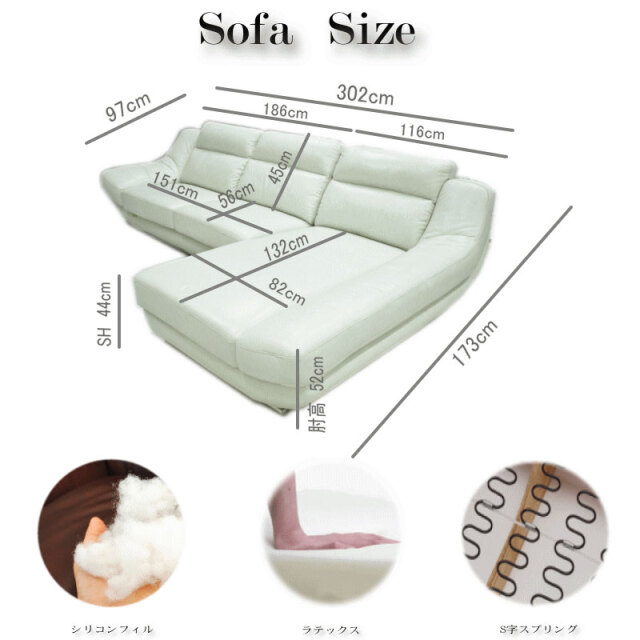 【素材】 イタリア製本革張り 一部PVC ラテックス シリコンフィル Sバネ 【サイズ】 全体:幅302×高さ86×奥行173(cm) 座面高さ44(cm) 2Pのみ:幅186×高さ86×奥行97(cm) 座面高さ44(cm) カウチのみ:幅116×高さ86×奥行173(cm) 座面高さ44(cm) 【特徴】 カラーはブラック・マーブルホワイト・ネイビーブルーカラーになります。 背もたれにはシリコンフィルが入っており、ふっくらで柔らかい座り心地です。 革にはイタリアンレザーを使用しており、耐久性と柔軟性を持ち合わせております。 上質な本革なので使い込むほどに独特の風合いが出ます。 寝心地、座り心地、肌触り抜群の商品です。 見た目だけではなく、使い心地も共に良い商品です。 ※お使いのモニターや照明器具等で実際の色とは若干異なって見える場合もございます。