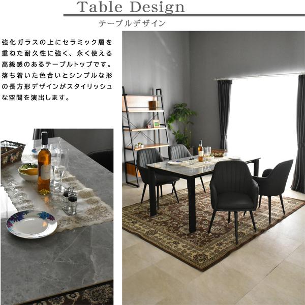 | 特徴 | 【お客様組立て】 ・セラミックトップ天板と大理石調の組合わせが素敵なテーブル ・天板は熱に強く傷にも強く耐水性に優れています ・ゆったりくつろげる150cm天板幅 ・テーブル+チェア4脚の5点セットとテーブル単品のみとチェア2脚を用意しています 必要な商品から選べます |