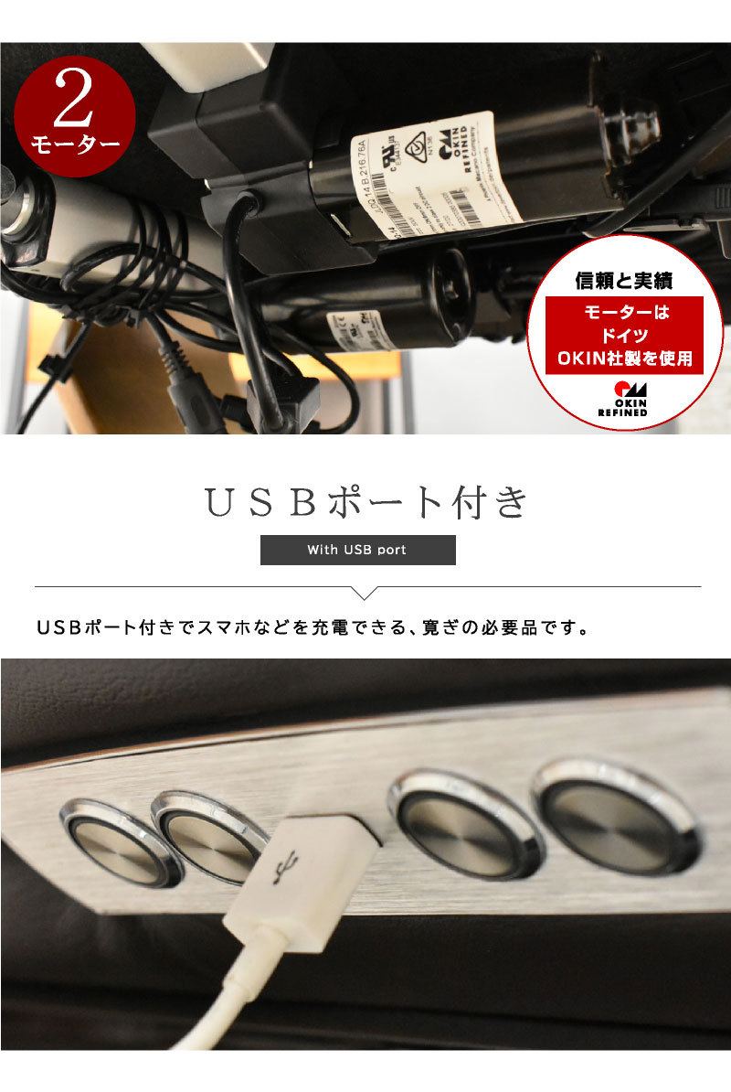 | 特徴 | 【ほぼ完成品】輸入品 ・ドイツOKIN社製モーター使用(2モーター) ・背と脚が独立して可動 ・スイッチ部にUSBポート ・動作中に青色LED点灯 ・座面360度回転 |
