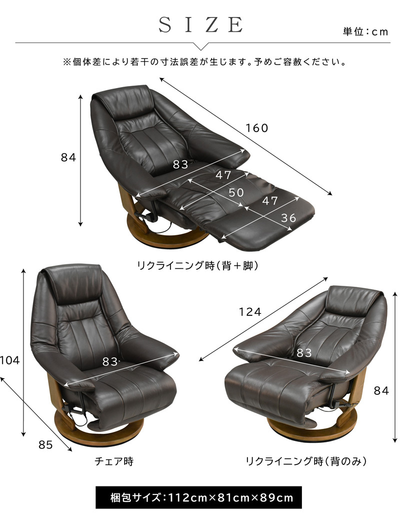チェア時:高104×幅83×奥85(cm) リクライニング時(背のみ):高84×幅83×奥124(cm) リクライニング時(背・脚):高84×幅83×奥160(cm) |