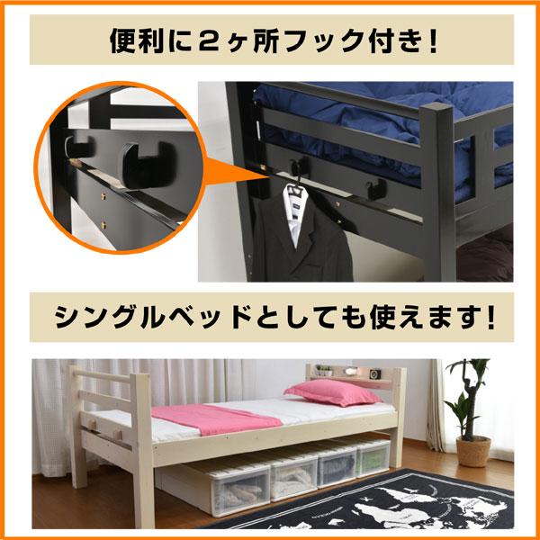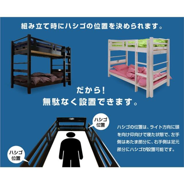 | 特徴 | \アウトレットで激安大特価!/ ・上下段LED照明、スライド式コンセント付き ・垂直はしごでスペースの有効活用が可能 ・上下空間が約1m有り大人でも余裕の出入り ・成人男性5人が乗っても余裕の耐荷重! ・北欧産のパイン無垢材を使用 ・耐震式の上下連結でぐらつきをなくす ・シングルベッド対応 ・社員寮や学生寮・民泊等でもご使用頂けます |