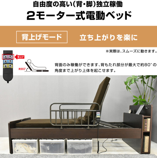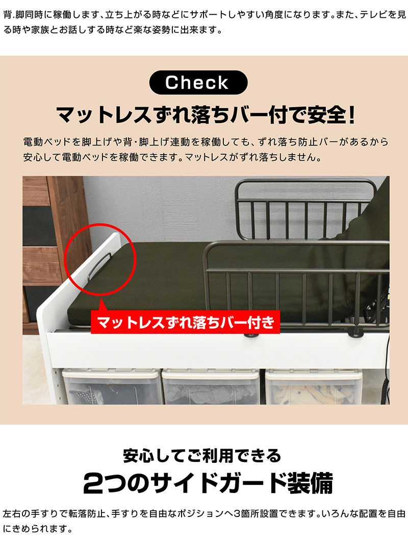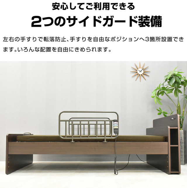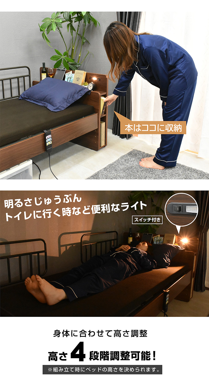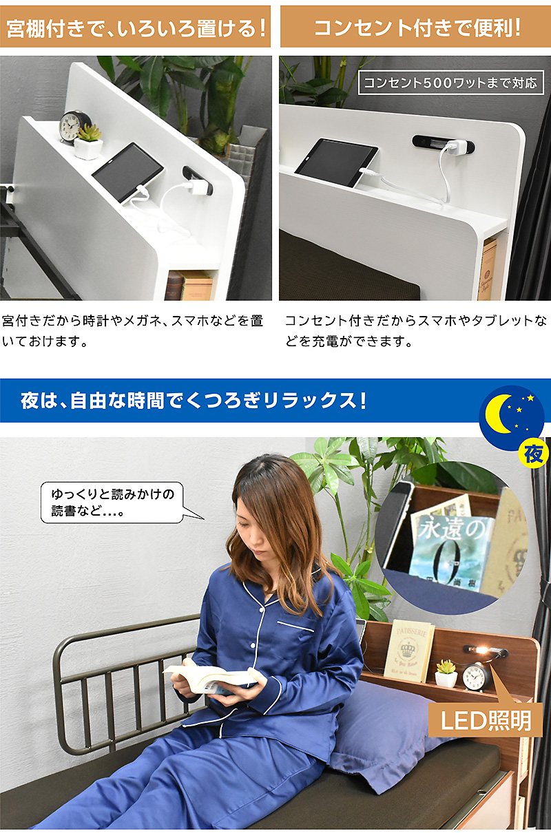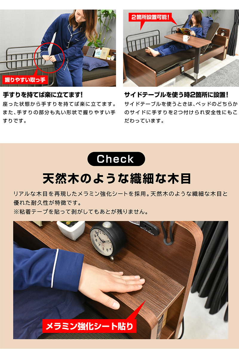 ・宮付きだから時計や眼鏡、スマホなどが枕元に置ける ・コンセント付きだからスマホやタブレットの充電が可能 ・LED照明付きで夜中も安心 ・サイド収納には本が入れられるスペースも ・身体に合わせて高さ4段階調整可能 ・ベッド下のフリースペースを活用できる ・独立稼働な2モーター式(背上げ、脚上げ、背・脚連動) ・マットレスずれ落ちバー付きで安全 ・左右の手すりで転落防止 ・天然木のような繊細な木目 ・消臭効果のある高反発竹炭ウレタンマットレス ・洗えるカバーでいつでも清潔 |