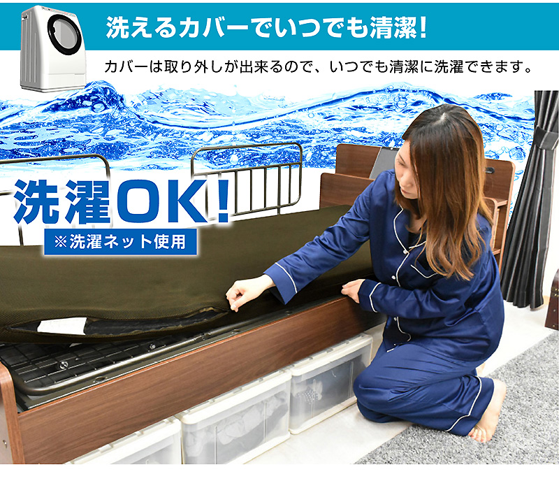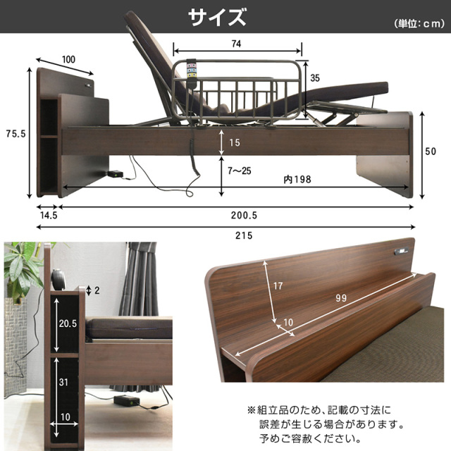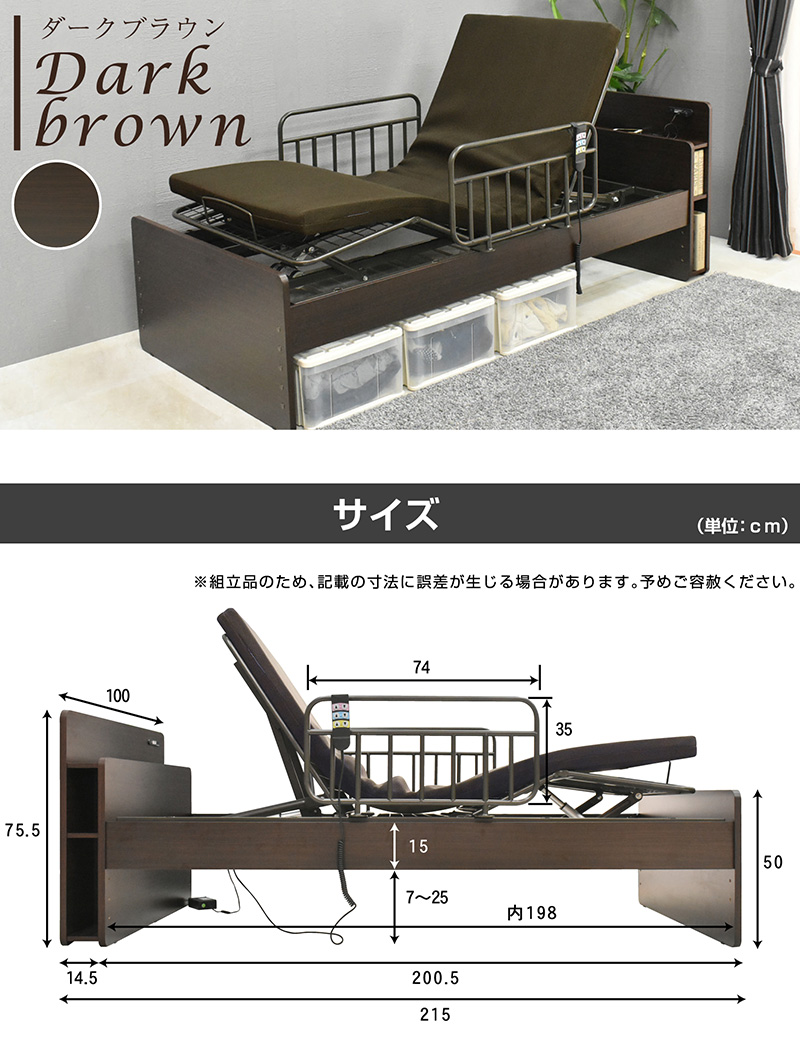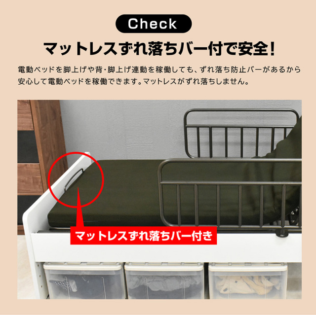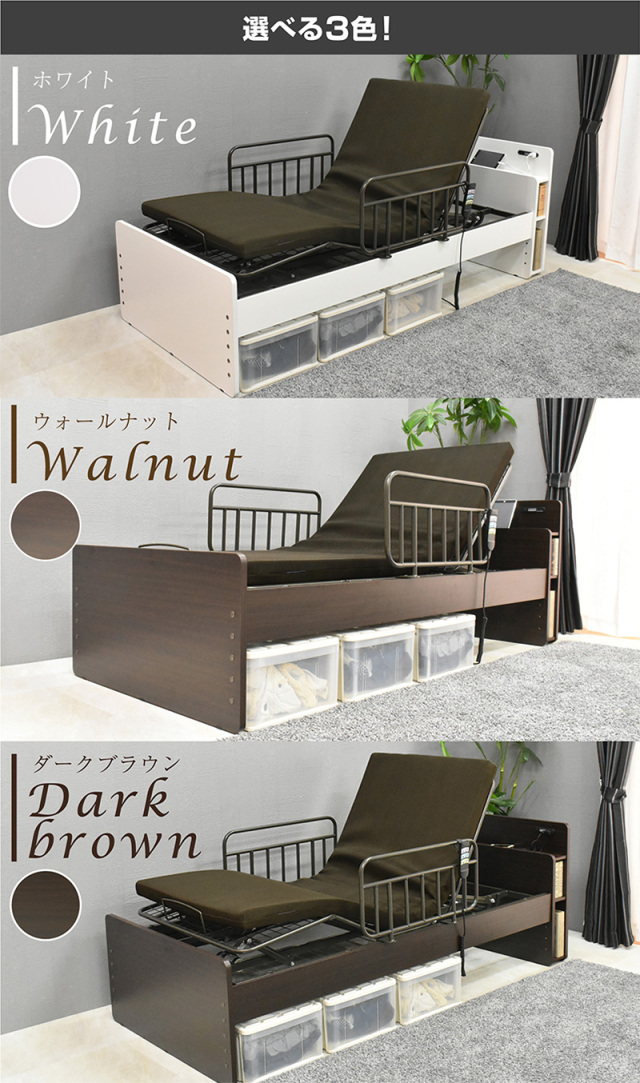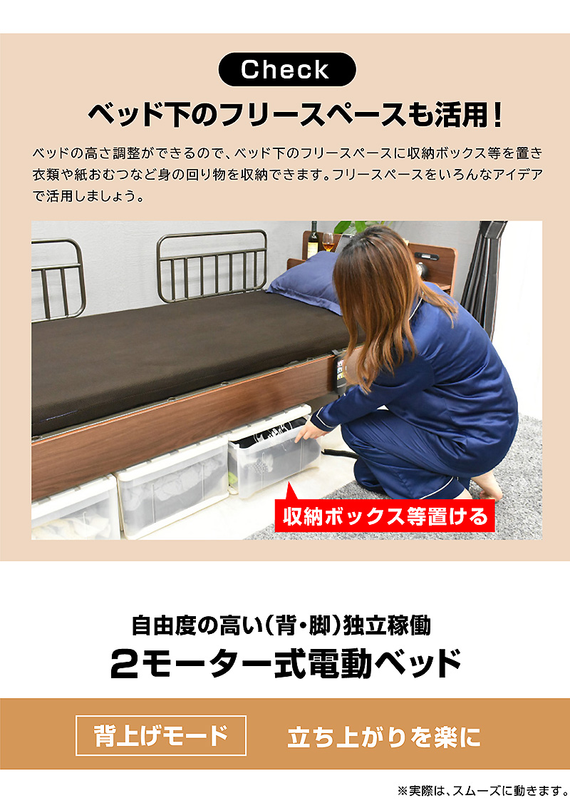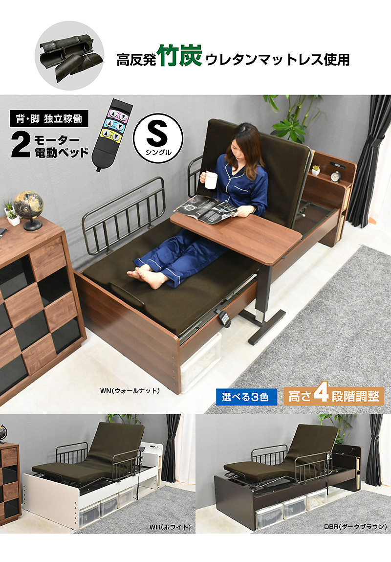 ・宮付きだから時計や眼鏡、スマホなどが枕元に置ける ・コンセント付きだからスマホやタブレットの充電が可能 ・LED照明付きで夜中も安心 ・サイド収納には本が入れられるスペースも ・身体に合わせて高さ4段階調整可能 ・ベッド下のフリースペースを活用できる ・独立稼働な2モーター式(背上げ、脚上げ、背・脚連動) ・マットレスずれ落ちバー付きで安全 ・左右の手すりで転落防止 ・天然木のような繊細な木目 ・消臭効果のある高反発竹炭ウレタンマットレス ・洗えるカバーでいつでも清潔 |