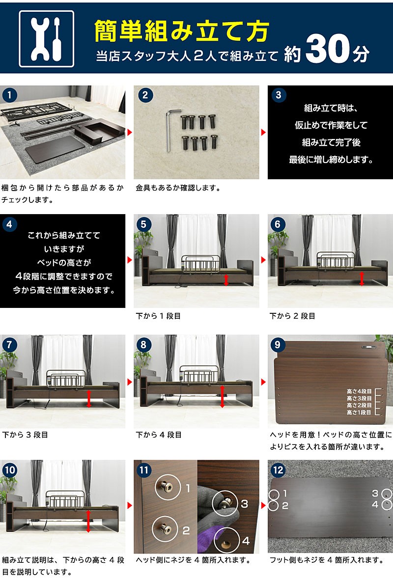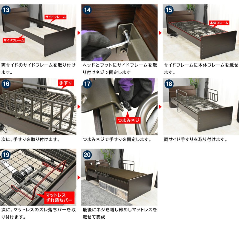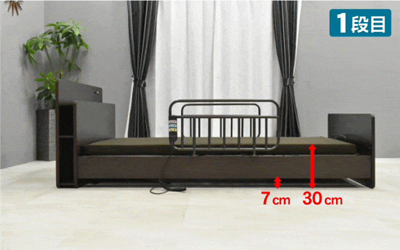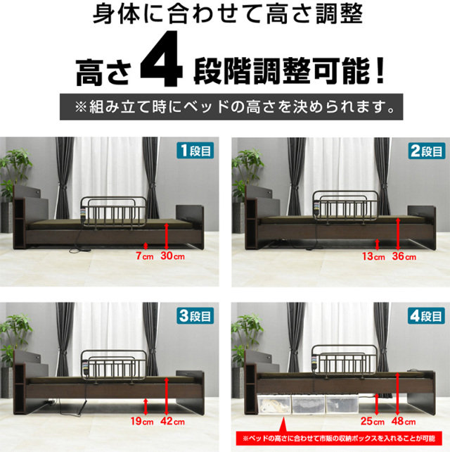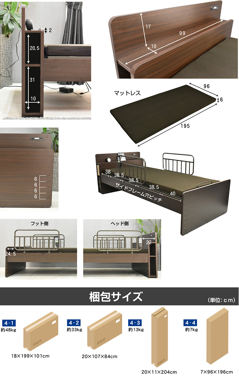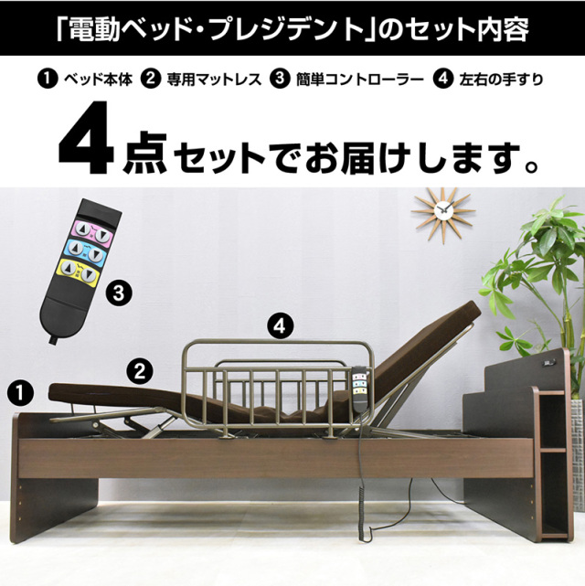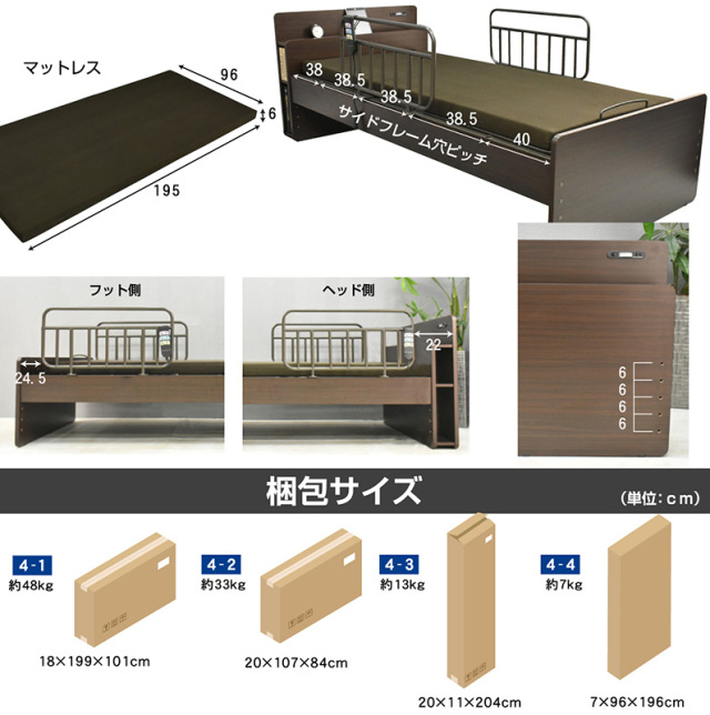 | セット内容 | 4点セット(ベッド本体、専用マットレス、簡単コントローラー、左右の手すり) |