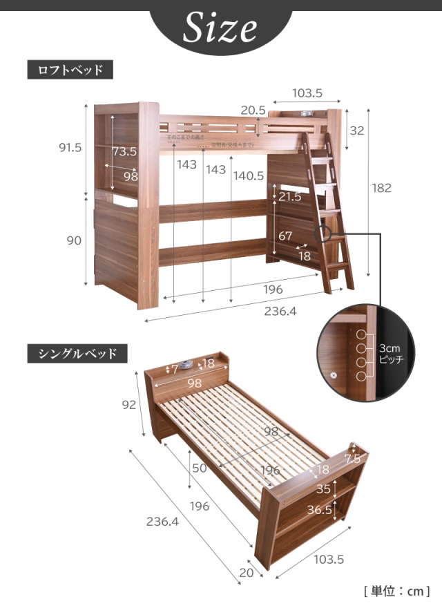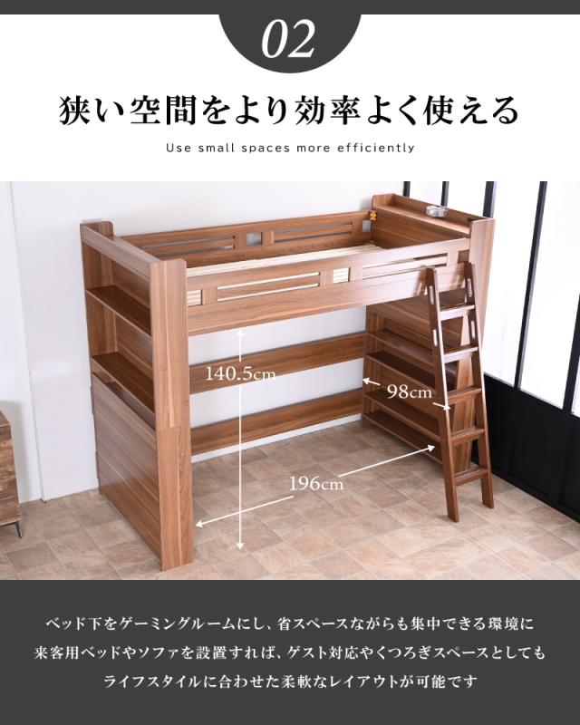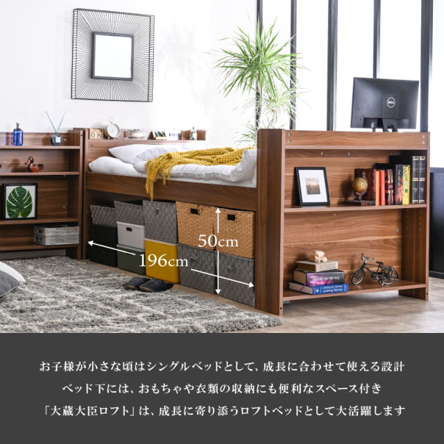 \シングルベッドになるロフトベッド/ ・ロフト下は自由に使えるフリースペース!狭い空間をより効率よくお使いいただけます ・たっぷりの収納スペース 縦長のものが置けるフリースペース 2段で仕切られてA4サイズも置けるスペース 3段で仕切られているから本をきれいに置ける 下段も左右に本棚スペースで余裕の収納力 ・宮棚にテレビが置けるスペース ・LED照明、2口コンセント付き ・中央に床板受桟木&丈夫な金具でガッチリ連結 さらにコの字でロフトを支える! ・LVLすのこでオールシーズン快適 ・キズに強く、強化紙仕上げのメラミン強化シート使用 ・ハシゴはどこでも設置可能 |