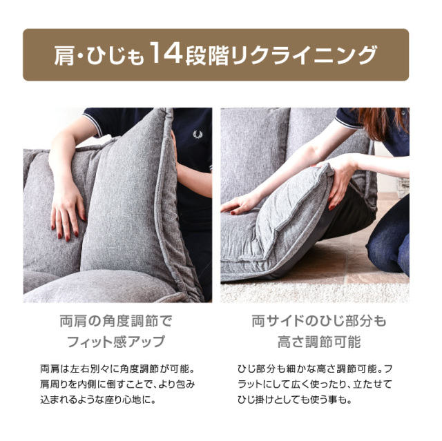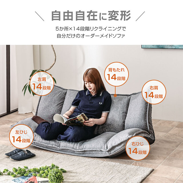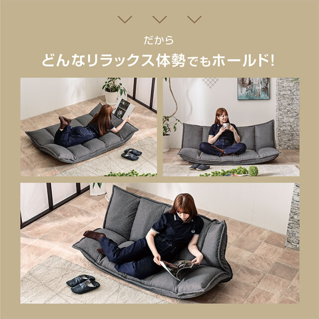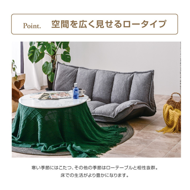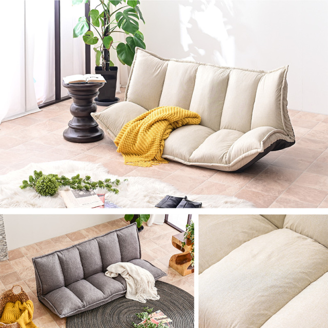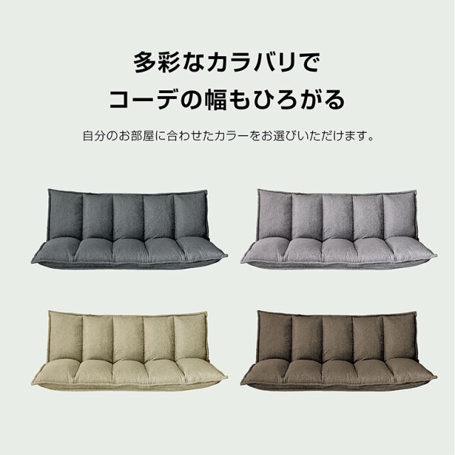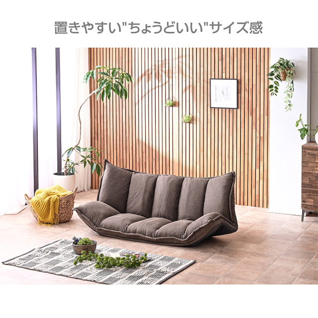 頑丈な内部構造と心地よいファブリックを組み合わせたフロアタイプのローソファです。背・座面肘・両サイドの計5か所が各14段で細かくリクライニングし、テレビ視聴から仮眠まで体勢に合わせてフィットします。座面高18cmでこたつやローテーブルと相性がよく、床座の暮らしに自然に溶け込みます。幅約152×奥行65〜107×高さ55cmのサイズ感でワンルームにも置きやすく、梱包は約103×65×31cm・約15kgと搬入もしやすい設計。完成品で届くため組立は不要、届いたその日から使えます。肌ざわりの良い生地と落ち着いたカラー展開が空間になじみ、来客時の簡易ベッドとしても活躍。日常のくつろぎから来客対応まで、長く安心して使える一台です。