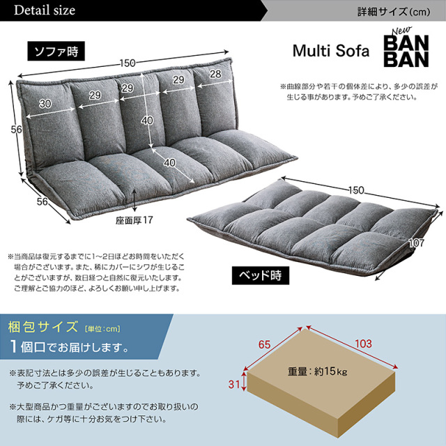 | 製品名: | ローソファ フロアソファ ソファベッド 一人暮らし向け 多機能 5か所14段リクライニング 座面高18cm 完成品 ニューバンバン |