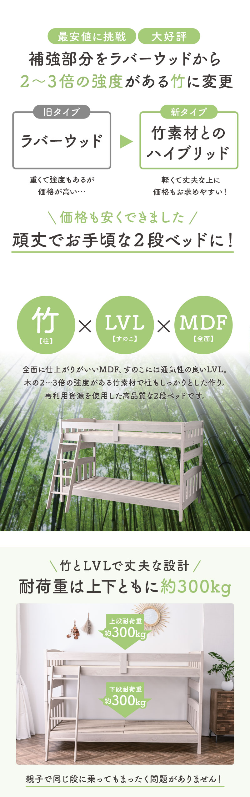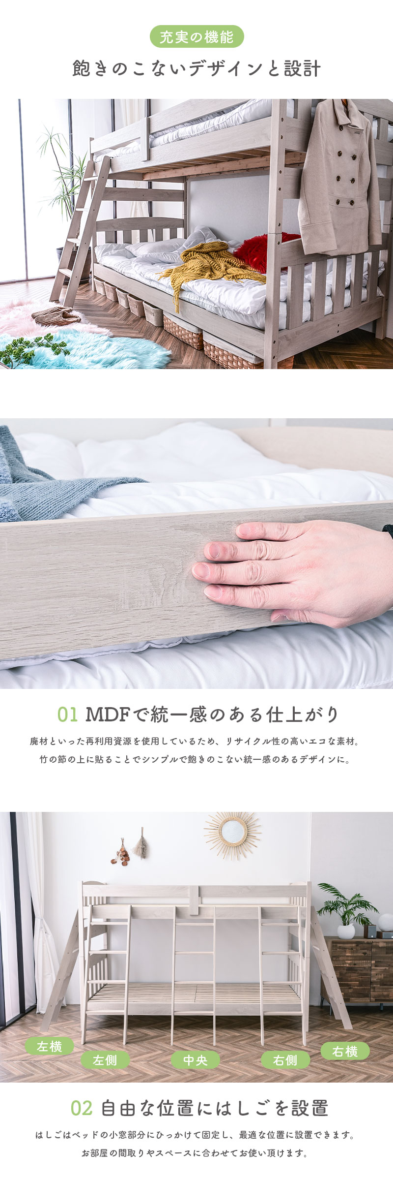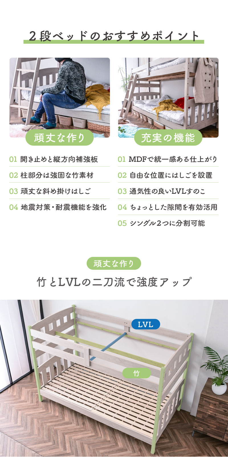 ・竹とLVLの二刀流で強度アップ ・柱部分は強固な竹素材 ・開き止めと縦方向補強板 ・頑丈な斜め掛けはしご ・地震対策・耐震機能を強化 ・MDFで統一感のある仕上がり ・自由な位置にはしごを設置 ・通気性の良いLVLスノコ ・ちょっとした隙間を有効活用 ・シングル2つに分割可能 |