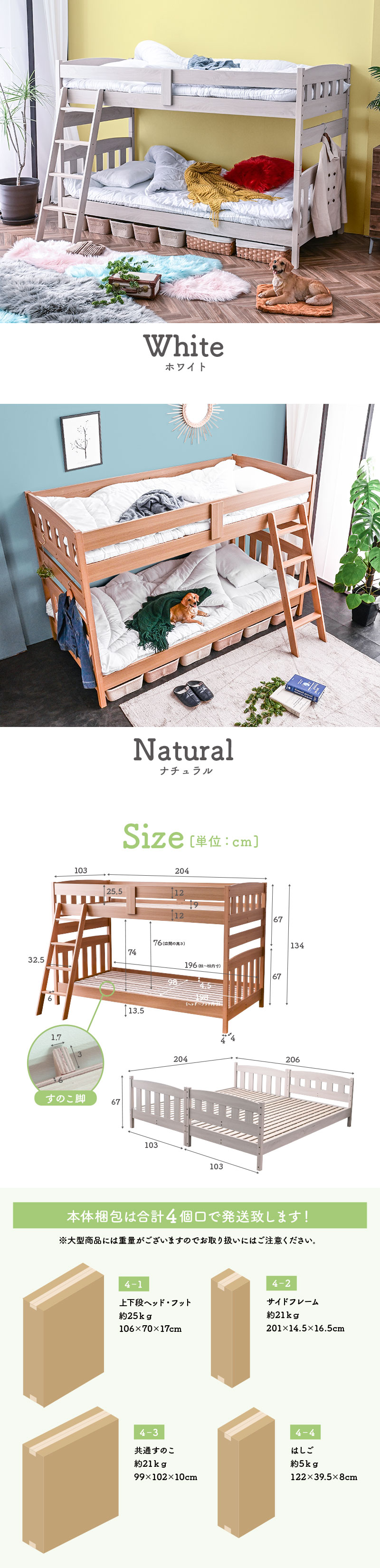 | 梱包サイズ(cm) | 【4-1 上下段ヘッド・フット】幅106×奥行き70×高さ17 25kg 【4-2 サイドフレーム】幅201×奥行き14.5×高さ16.5 21kg 【4-3 共通スノコ】幅99×奥行き102×高さ10 21kg 【4-4 ハシゴ】幅122×奥行き39.5×高さ8 5kg ※フレームのみは4個口、マットレス付きは6個口 |
