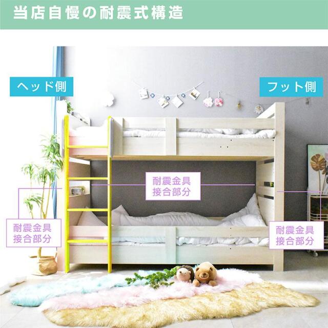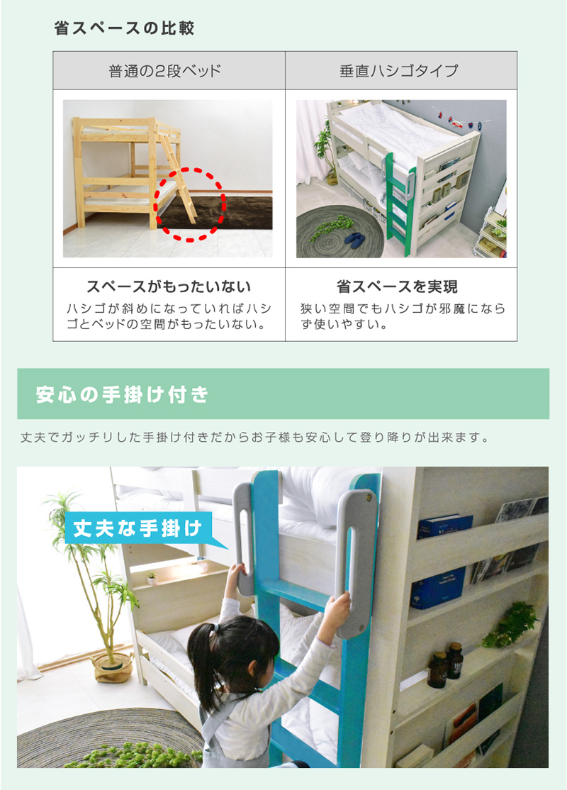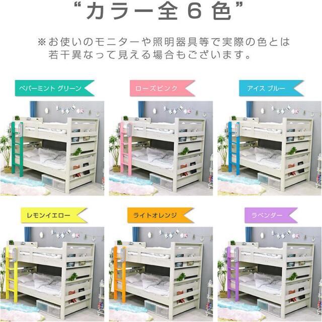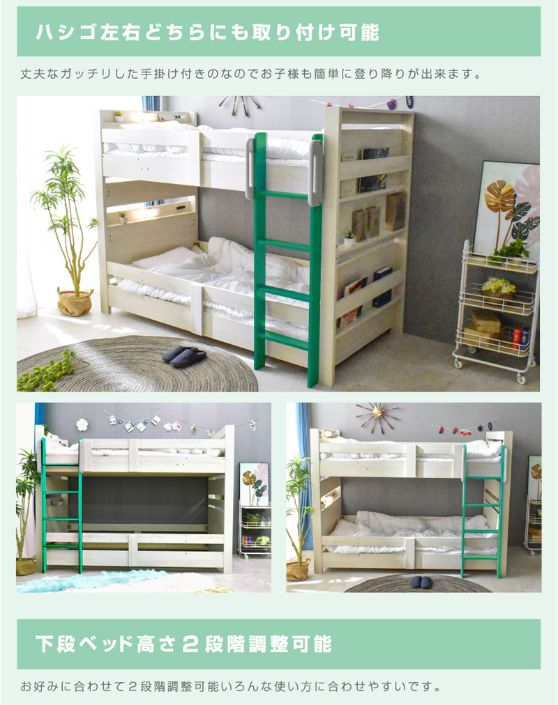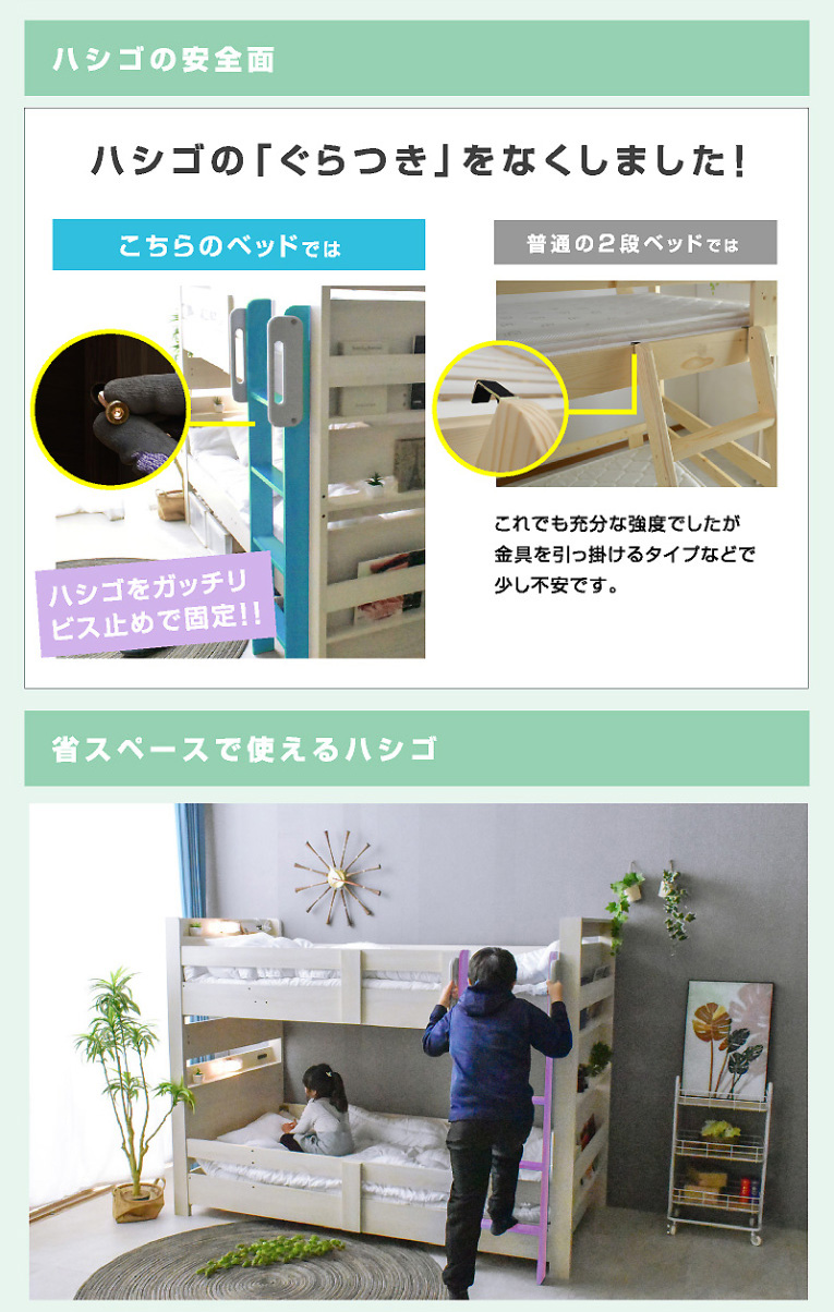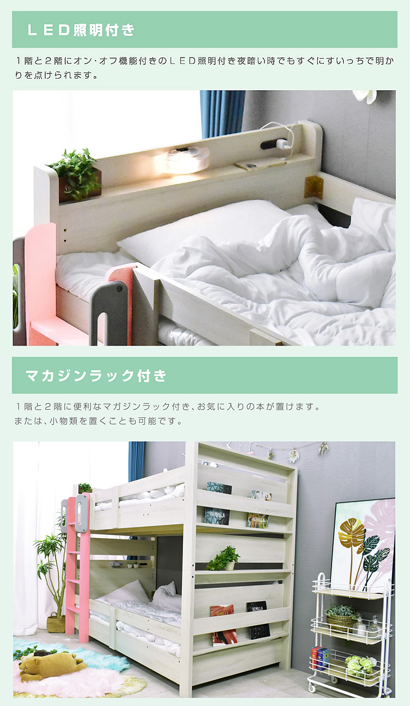 \自分好みに選べるカラー全6色/ ・左右のベッドの高さが同じフラット設計 ・お子様が小さいうちはクイーンベッドとして、兄弟仲良く話して使うことも可能 ・上段に縦の補強板を追加して強度をアップ! ・上段と下段のつなぎ目を固定することで縦ブレをなくし、開き止めで横ブレを防ぐ ・ハシゴをビス止めでガッチリ固定でぐらつきなし ・省スペースを実現する垂直ハシゴタイプ ・ハシゴには丈夫な手掛け付きだから安心して昇り降りができる ・下段ベッド高さ2段階調整可能 ・宮棚、便利な2口コンセント、LED照明、マガジンラック付き ・すのこ床板でオールシーズン快適 |