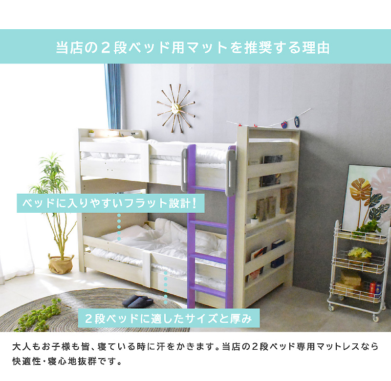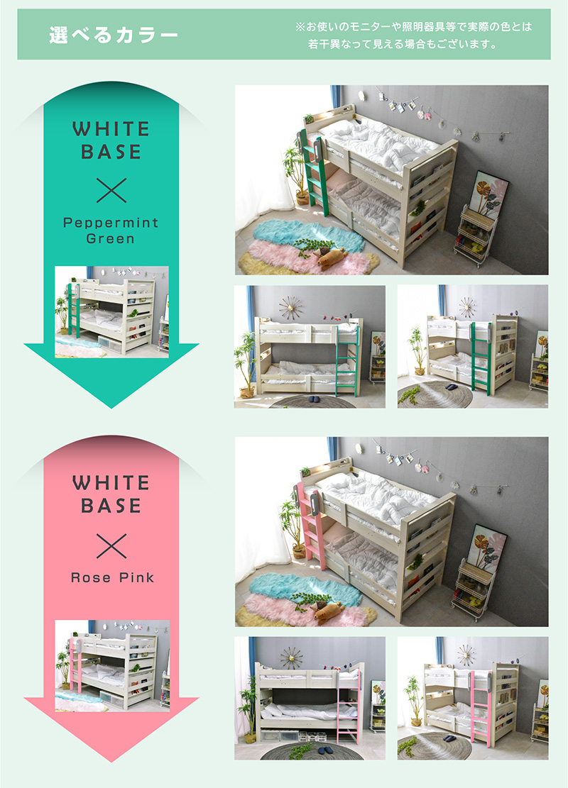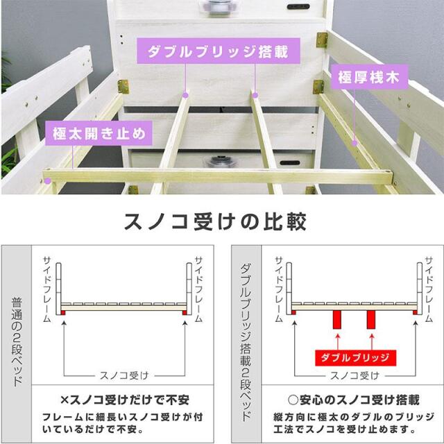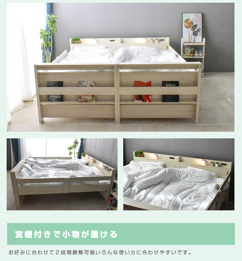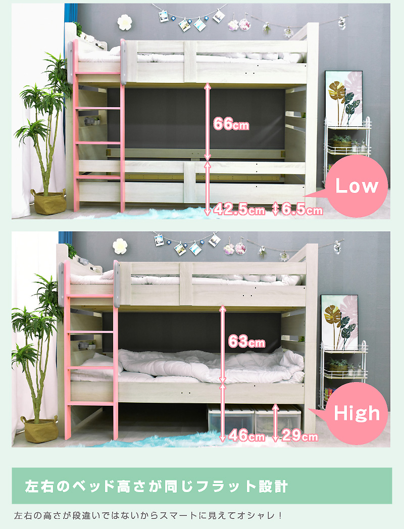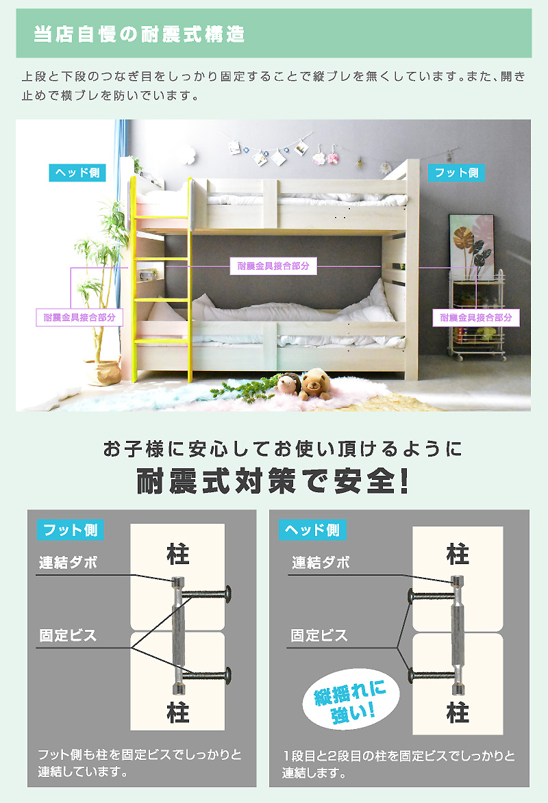 \自分好みに選べるカラー全6色/ ・左右のベッドの高さが同じフラット設計 ・お子様が小さいうちはクイーンベッドとして、兄弟仲良く話して使うことも可能 ・上段に縦の補強板を追加して強度をアップ! ・上段と下段のつなぎ目を固定することで縦ブレをなくし、開き止めで横ブレを防ぐ ・ハシゴをビス止めでガッチリ固定でぐらつきなし ・省スペースを実現する垂直ハシゴタイプ ・ハシゴには丈夫な手掛け付きだから安心して昇り降りができる ・下段ベッド高さ2段階調整可能 ・宮棚、便利な2口コンセント、LED照明、マガジンラック付き ・すのこ床板でオールシーズン快適 |