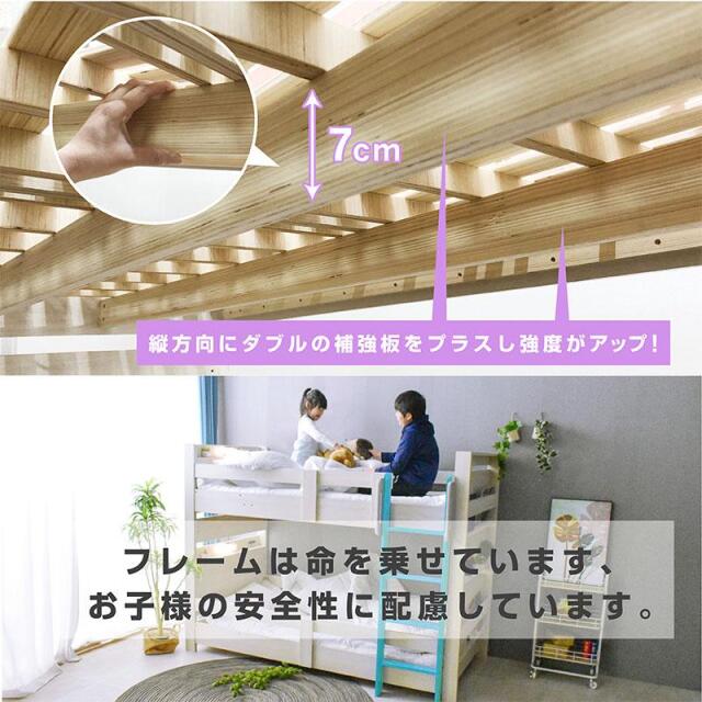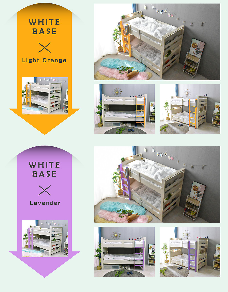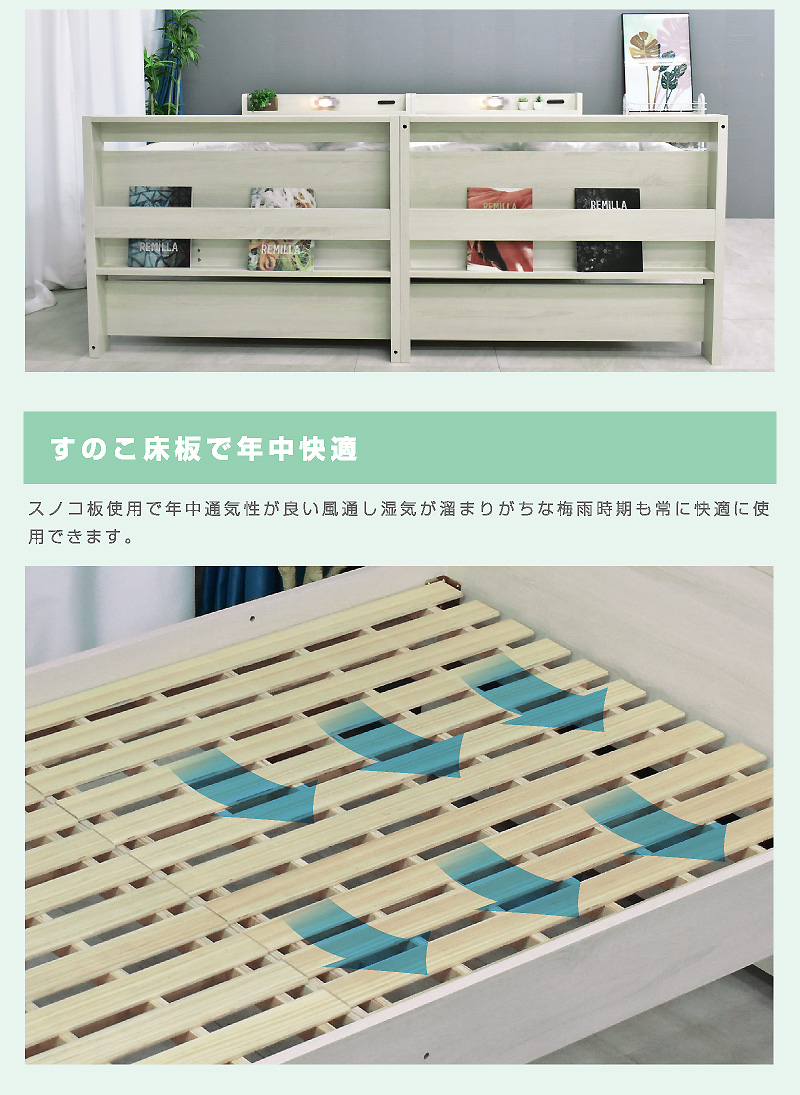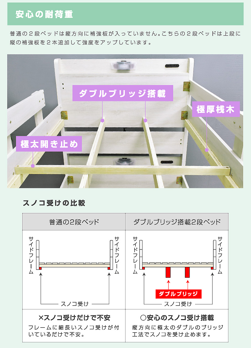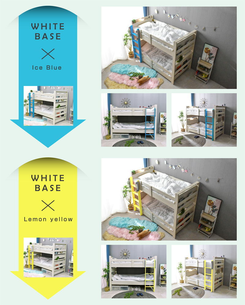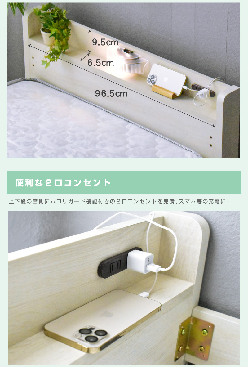 \自分好みに選べるカラー全6色/ ・左右のベッドの高さが同じフラット設計 ・お子様が小さいうちはクイーンベッドとして、兄弟仲良く話して使うことも可能 ・上段に縦の補強板を追加して強度をアップ! ・上段と下段のつなぎ目を固定することで縦ブレをなくし、開き止めで横ブレを防ぐ ・ハシゴをビス止めでガッチリ固定でぐらつきなし ・省スペースを実現する垂直ハシゴタイプ ・ハシゴには丈夫な手掛け付きだから安心して昇り降りができる ・下段ベッド高さ2段階調整可能 ・宮棚、便利な2口コンセント、LED照明、マガジンラック付き ・すのこ床板でオールシーズン快適 |