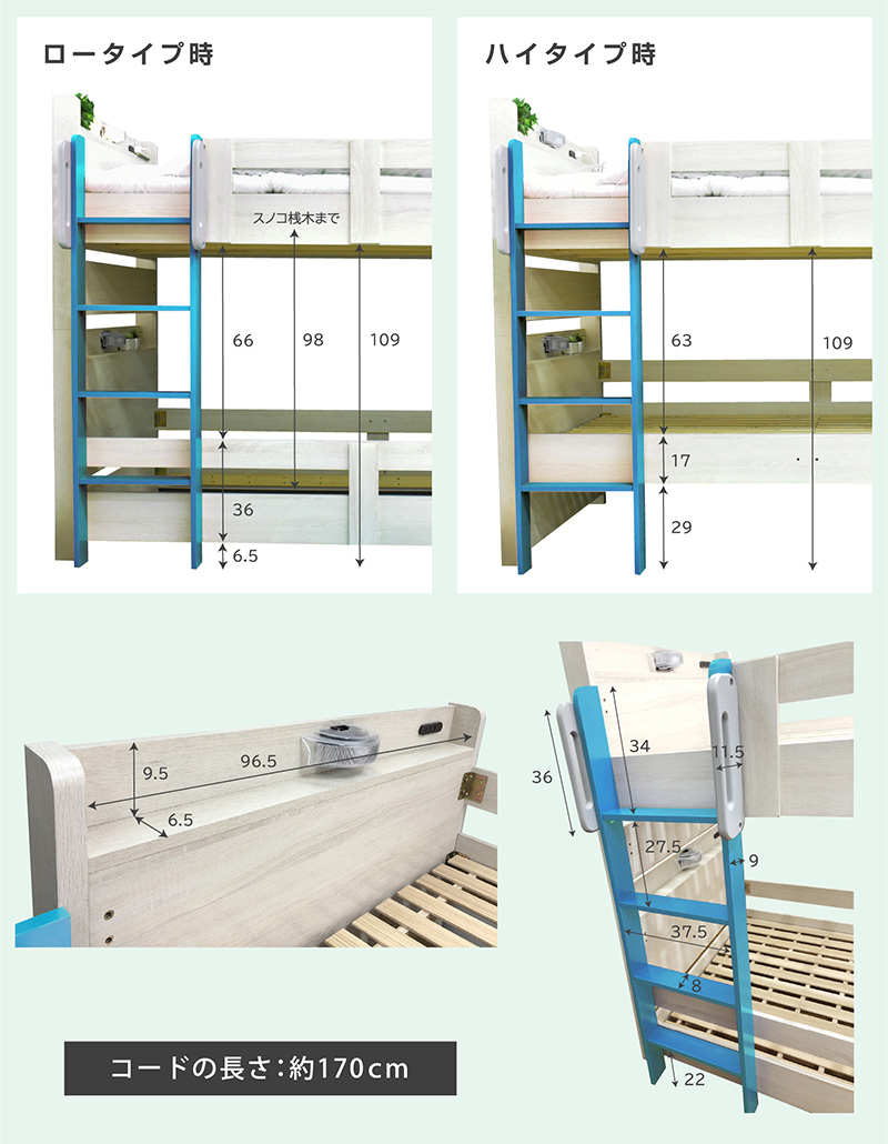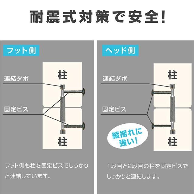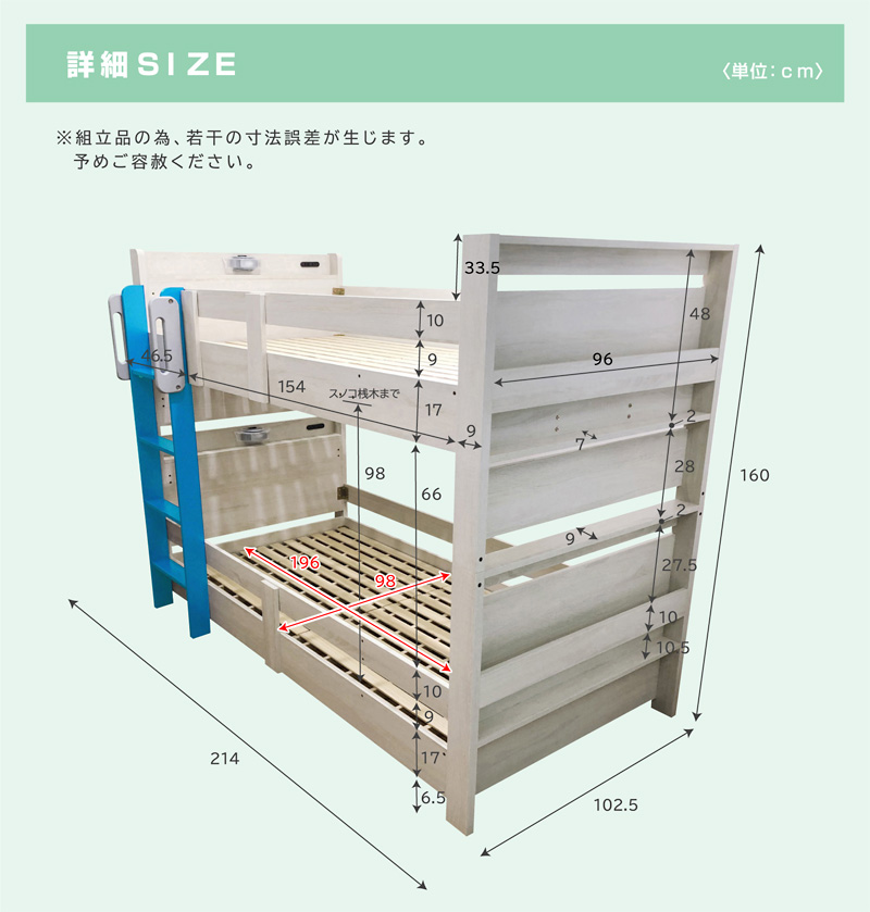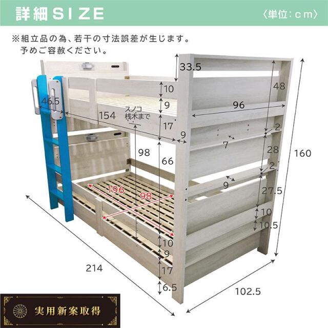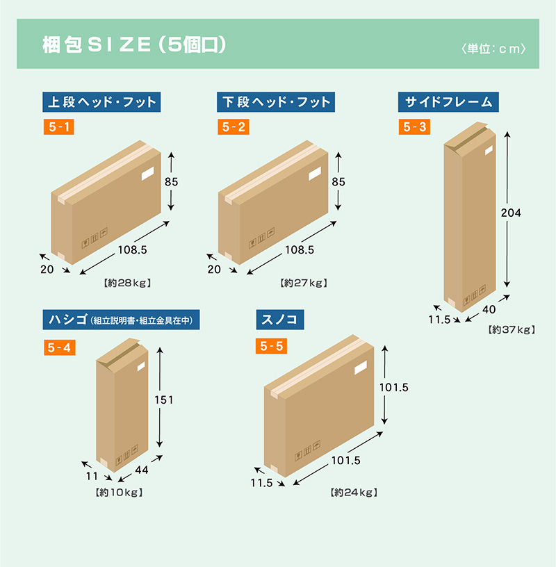 | 梱包サイズ | (5-1)上段ヘッド・フット 108.5×20×85(cm) 約28kg (5-2)下段ヘッド・フット 108.5×20×85(cm) 約27kg (5-3)サイドフレーム 40×11.5×204(cm) 約37kg (5-4)ハシゴ 44×11×151(cm) 約10kg (5-5)スノコ 101.5×11.5×101.5(cm) 約24kg |