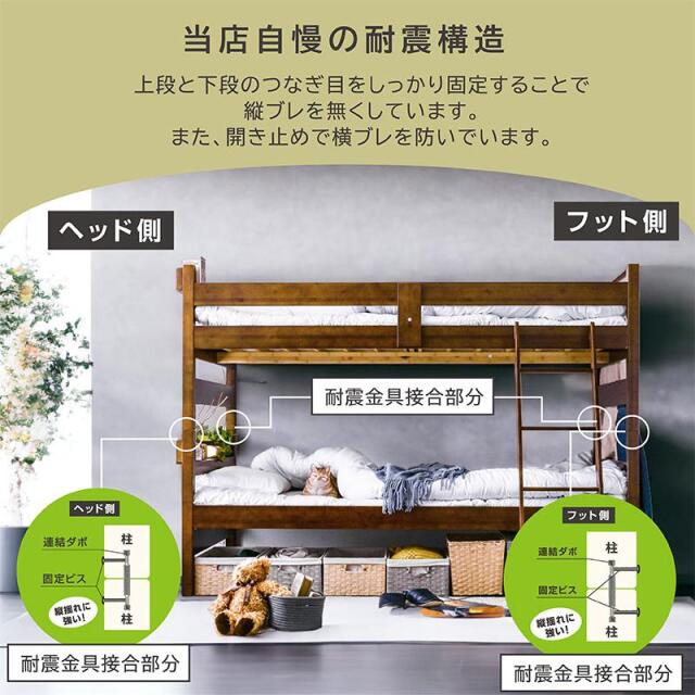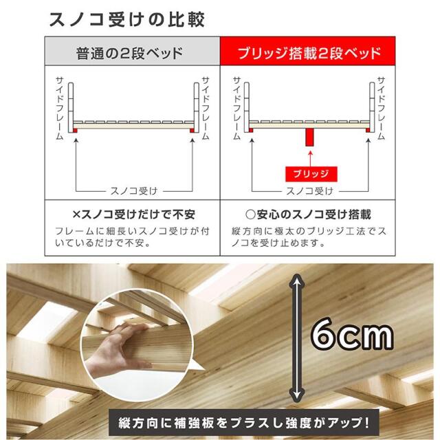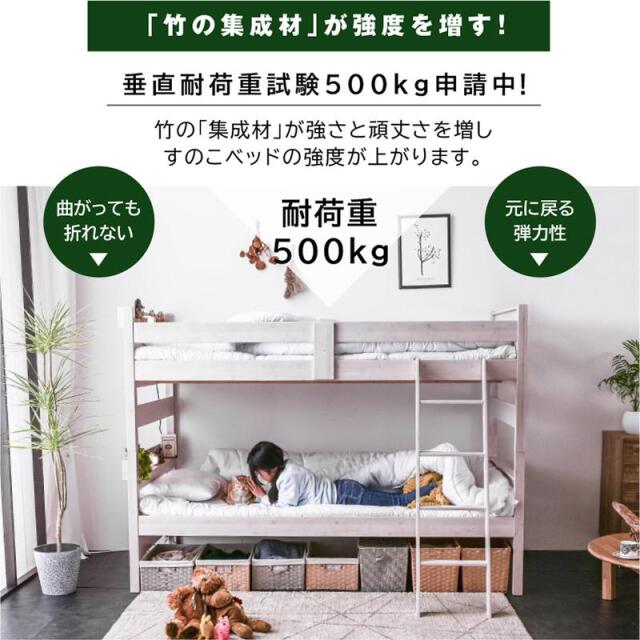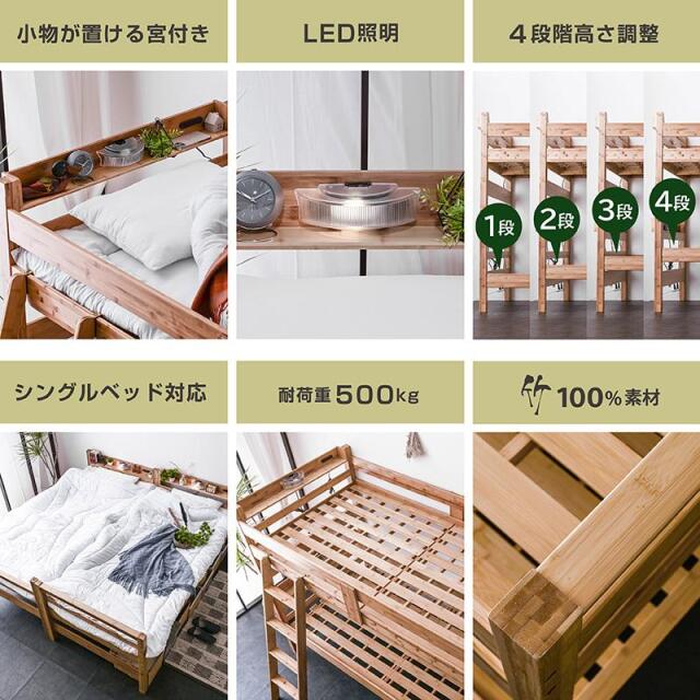 \木の約3倍以上強度がある竹100%使用!/ ・持続可能なカーボンニュートラル ・スマホスタンド&2口コンセント付き宮棚 ・明るさがあると便利LED照明付き ・2段ベッドの下段は4段階高さ調整可能 ・ベッド下のフリースペースも有効活用 ・縦方向に補強板を追加してさらに強度アップ! ・上下段のつなぎ目をしっかり固定することで縦ブレをなくし、開き止めで横ブレを防ぐ ・竹製すのこ床板は抗菌効果 ・安心・安全のホルムアルデヒド濃度 ・はしごはいろんな所に取り付け可能 ・将来の事も考えてシングルにもできる |