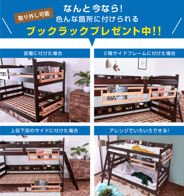 | 特徴 | 【お客様組立て】 ・竹100%! ・耐荷重500kg大人の方も安心! ・持続可能なカーボンニュートラル ・硬い強度、木の約3倍以上 ・本や小物が置けて便利 ・上下段サイドにワイド宮棚 ・上下段LED照明は左右取り付け可能 ・オールシーズン快適な竹製床板 ・将来の事も考えてシングルにもできる ・ハシゴの位置は自由に取り付けOK ・上下段2個口のコンセント付き ・上下段分離可能シングル対応 ・当店自慢の耐震式で安全 |