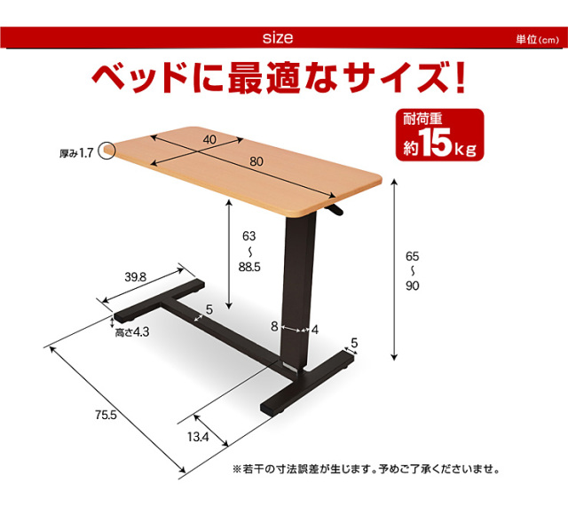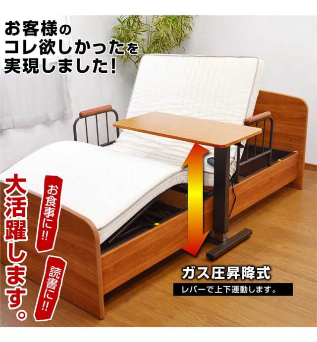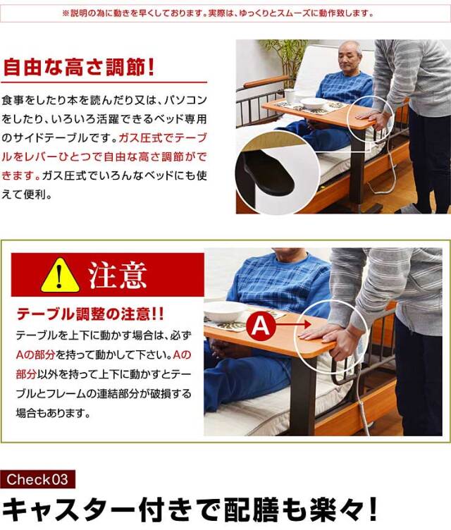 カラー ナチュラル(LBR) ブラウン(DBR)材質 スチール/MDF/強化シート貼り仕様 ・ 介護に適したサイドテーブル・当店の電動ベッド「ケア1」「ケア3」との色合いバッチリ (もちろん他の電動ベッドでもお使い頂けます)・ガス圧での昇降式で簡単に上下できます・キャスター付きで移動も簡単・ベッドと床の隙間が5cm以上あれば、殆どのベッドでご利用頂けます。サイズ 幅80cm*長40cm*高65~95cm(台座高4.3cm)送料 【送料無料】ただし、 北海道・沖縄地域は追加送料(税別)が必要となります。(離島は別途お見積り)また、開梱設置サービスをご利用の場合、送料とは別に料金が必要です。ご注文前にお問い合せください。※追加料金が必要な場合、買い物カゴでは再計算されません。 料金確定後、こちらからご連絡させていただきます。