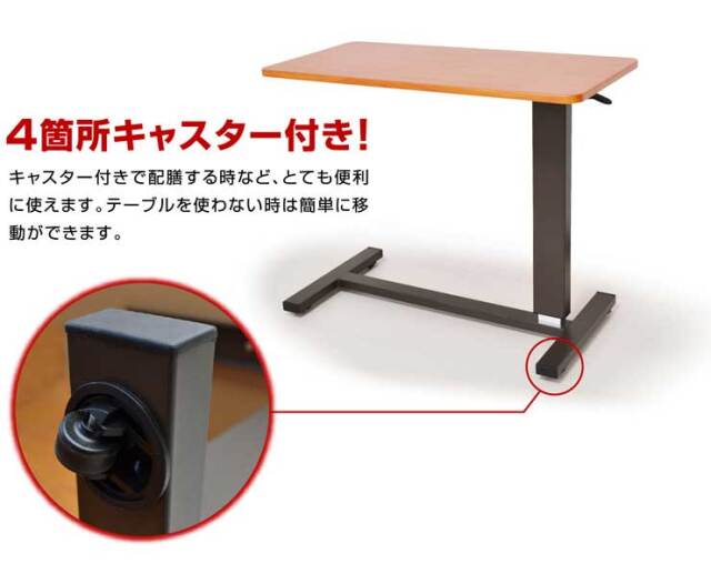 \介護に適したサイドテーブル/ ・ガス圧昇降式でテーブルの高さ調節が可能 ・普段使う場合の耐荷重は約15kgまで対応可能 ・4箇所キャスター付きで配膳も楽々 ・アイデア次第でいろんな使い方ができます (パソコンの補助テーブル、ソファのセンターテーブル、カウンターテーブル等) |