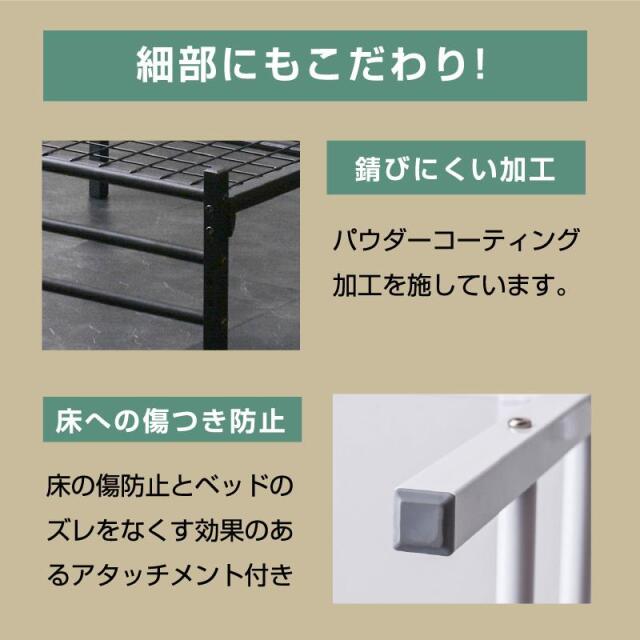 | 素材 | ベッド:スチール(粉体塗装) 宮棚:強化紙化粧繊維板 傷防止キャップ付き |