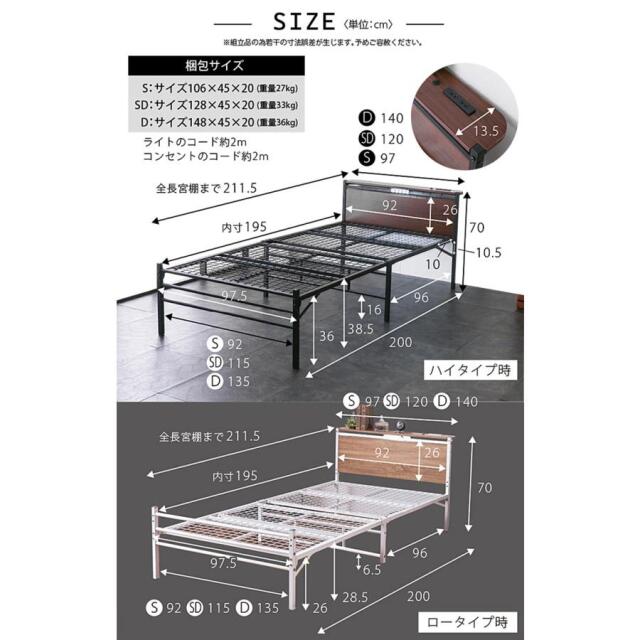 | サイズ | 本体フレーム:幅(S)97.5 (SD)120 (D)140 ×長211.5×高70(cm) |