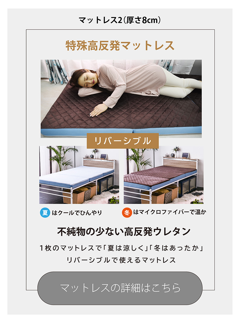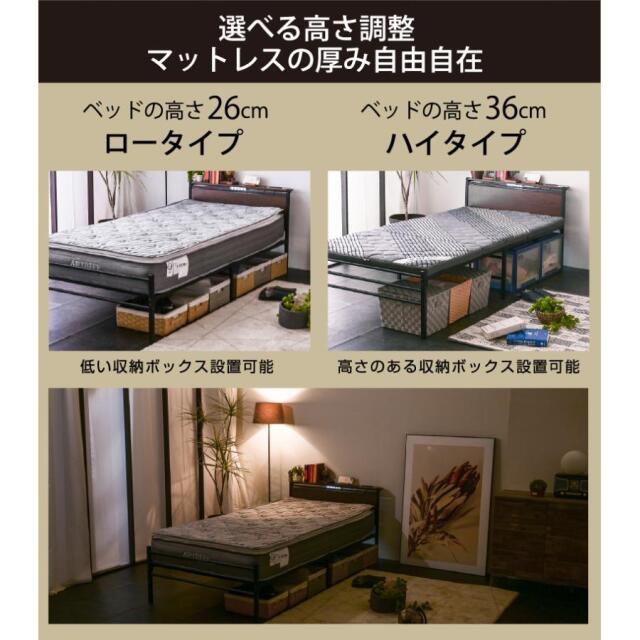 \異素材ミックスベッド/ ・スチールフレームに木目調のヘッドボードを組み合わせたシンプルモダンベッド ・フレーム補強パーツ&ベッド中央部分に脚2本を追加して強度アップ! ・コンセント、宮棚、LEDライト付き ・2段階高さ調節(ハイモード、ローボード) ・ハイタイプには薄め、ロータイプには厚めのマットレスがおすすめ ・強度の高い12本のサポートバーとメッシュ床で耐圧を分散 ・強いスチールパイプをしっかり連結して、がたつきや軋み音を軽減 ・錆びにくいパウダーコーティング加工 ・床の傷防止とベッドのずれをなくすアタッチメント付き ・通気性の良いメッシュ構造を採用 ・シングルベッド2台でキングサイズにも |