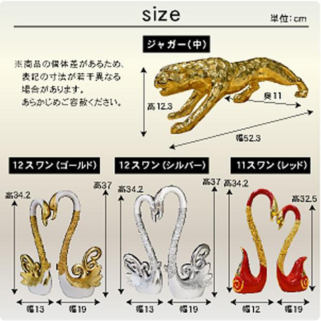 | サイズ | ジャガー(中):幅52.3×奥11×高12.3 ジャガー(小):幅28×高7 (11)スワン:幅12/19×高32.5/34.2 (12)スワン:幅13/19×高34.2/37 (13)スワン:幅13×高23/26 (25)スワン:幅16×高31/39.8 ウマ(財):幅27.8×高37.8 ウマ:幅27.5×高37 |