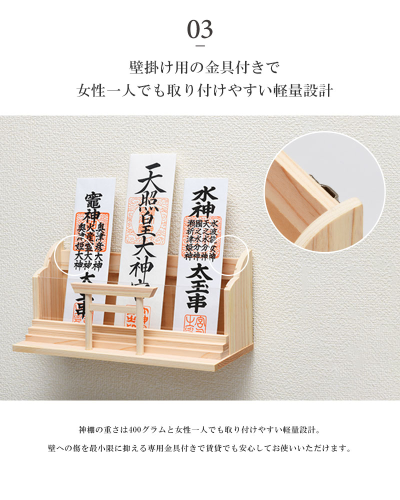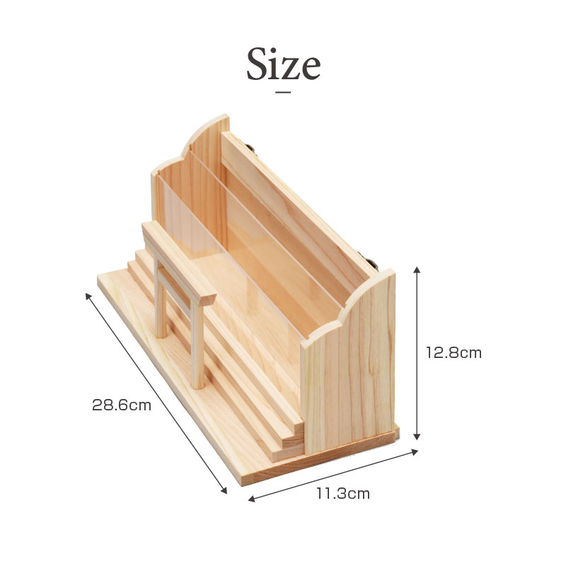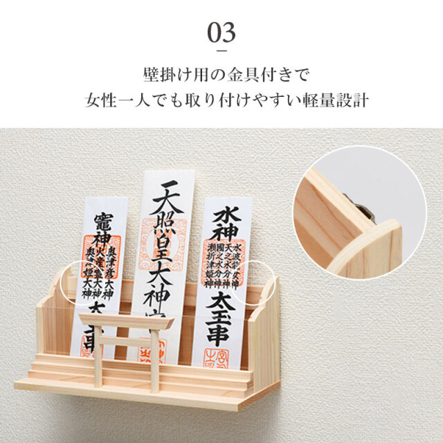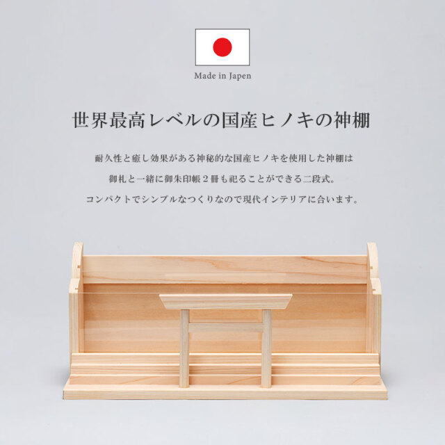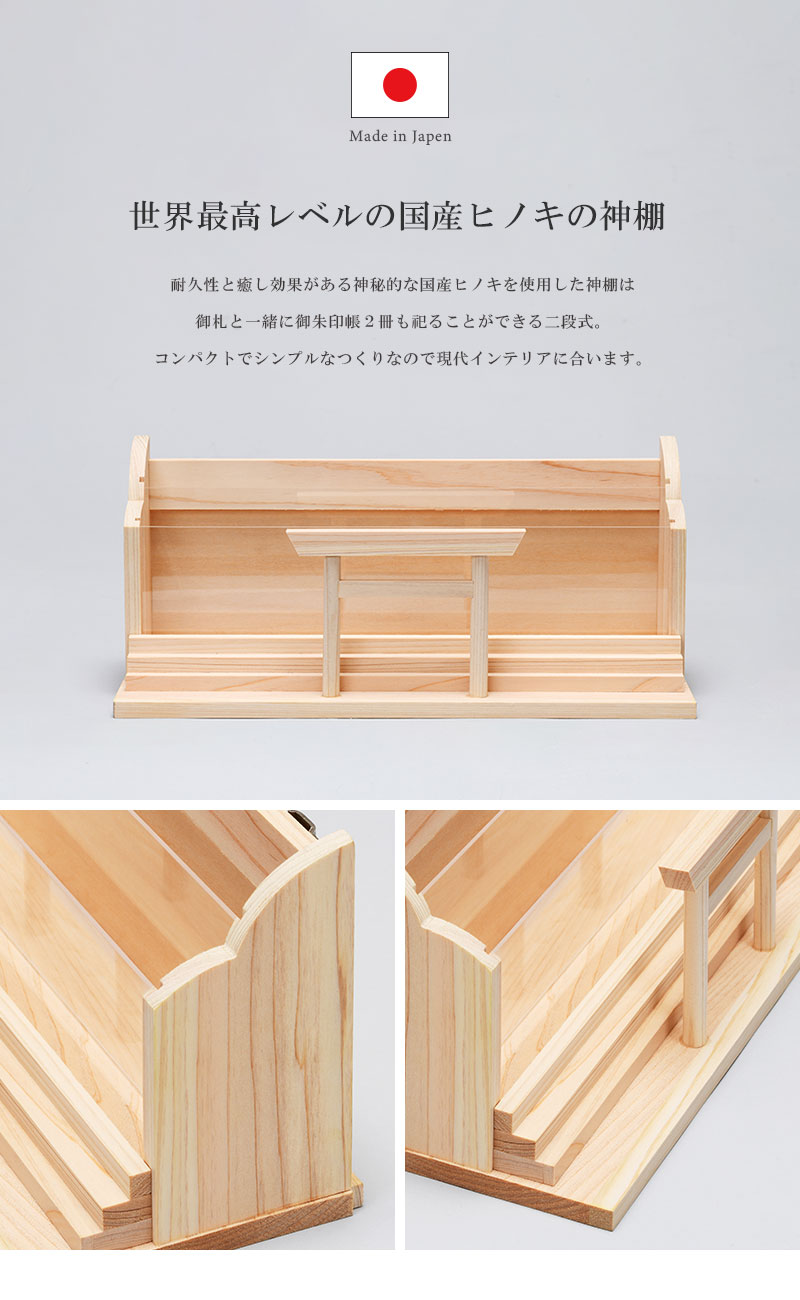 | 特徴 | ・世界最高レベルの国産ヒノキを使用 ・御札と一緒に御朱印帳も祀ることができる二段式 ・インテリアの邪魔をしない暮らしに溶け込むシンプルなつくり ・壁掛け用の金具付きで女性一人でも取り付けやすい軽量設計 |