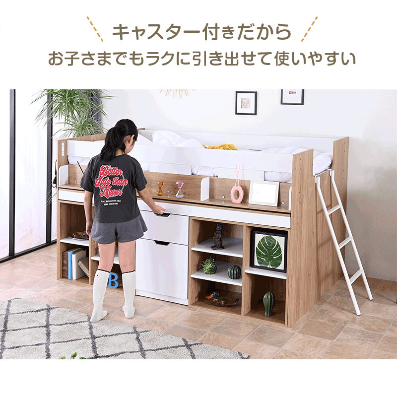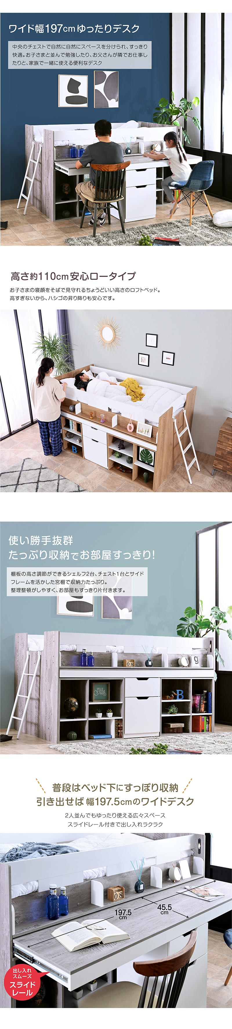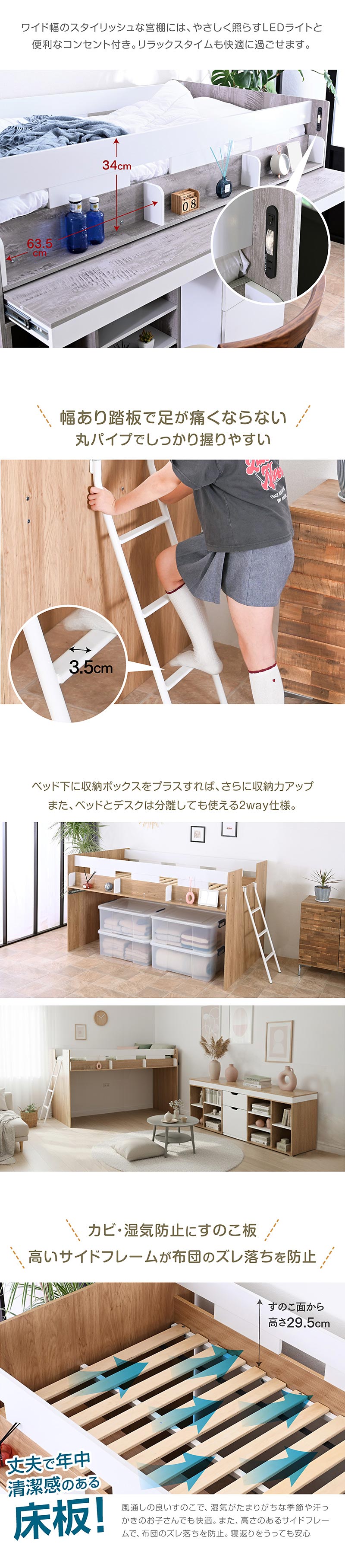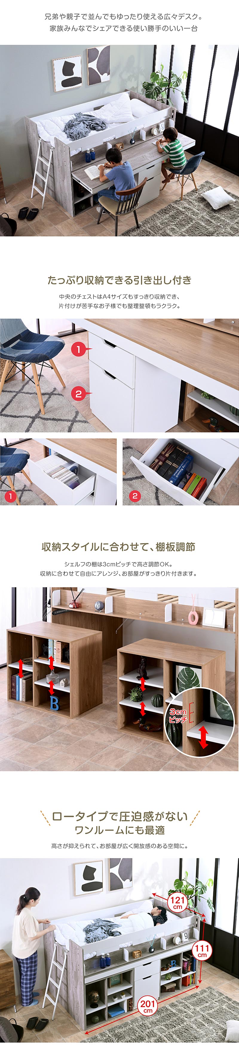 \家族で使える、多機能システムベッド/ ・ロータイプロフトベッドとデスクの一体型システムベッド ・デスクには引き出し収納が2つ付き。キャスター付きでデスクの移動が可能です。 ・オープンシェルフが2個付き。棚板可動式で収納に合わせて高さ調節可能。 ・ロフトベッド、デスク、シェルフは、それぞれ独立して使えます ・ベッドサイドにワイド宮棚付き 本や小物が置けて便利 ・ワイド宮棚にはLEDライト・コンセント付き。スマホなどの充電に便利 ・はしごは左右どちらにも取付可能。幅がある踏板で安心して昇り降り出来ます ・高さのあるサイドフレームで布団のズレ落ちも防止 ・スノコ受けと中央の補強はスチール製でしっかりと支えます ・オールシーズン快適なスノコ床板、ロールタイプで設置も簡単 |