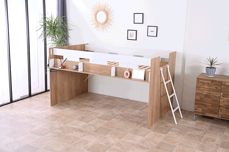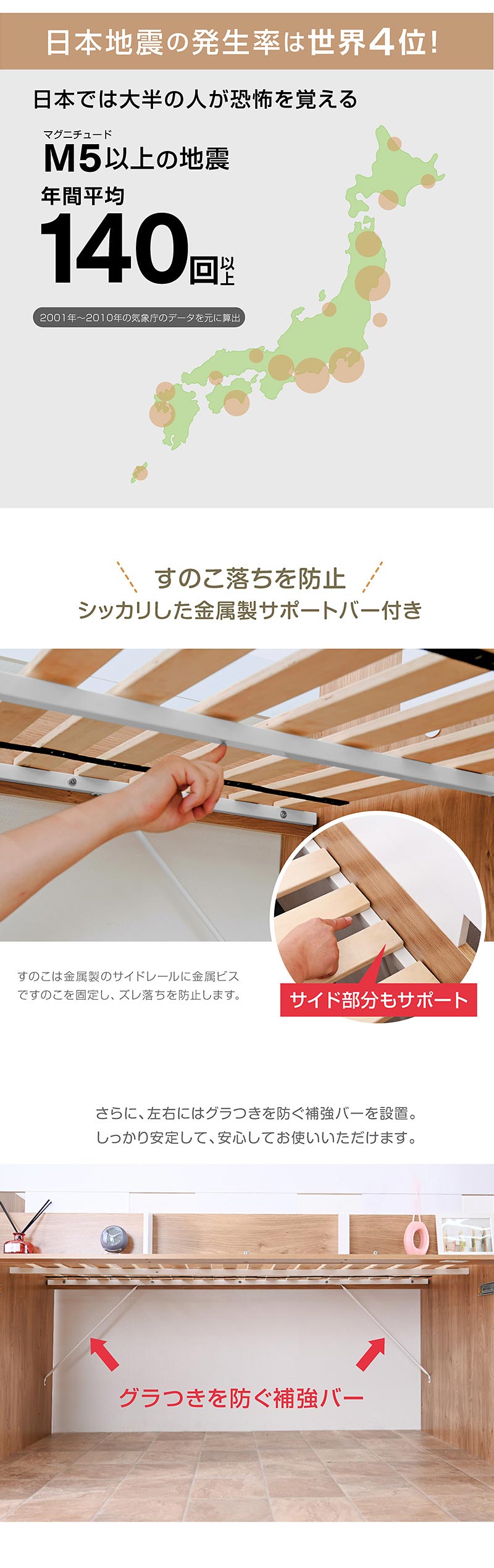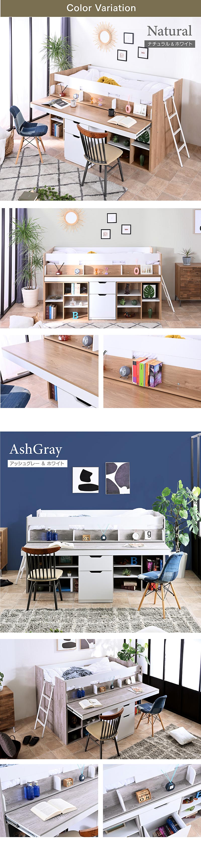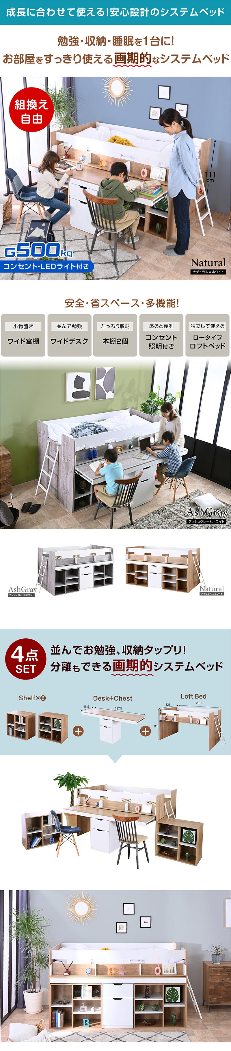 \家族で使える、多機能システムベッド/ ・ロータイプロフトベッドとデスクの一体型システムベッド ・デスクには引き出し収納が2つ付き。キャスター付きでデスクの移動が可能です。 ・オープンシェルフが2個付き。棚板可動式で収納に合わせて高さ調節可能。 ・ロフトベッド、デスク、シェルフは、それぞれ独立して使えます ・ベッドサイドにワイド宮棚付き 本や小物が置けて便利 ・ワイド宮棚にはLEDライト・コンセント付き。スマホなどの充電に便利 ・はしごは左右どちらにも取付可能。幅がある踏板で安心して昇り降り出来ます ・高さのあるサイドフレームで布団のズレ落ちも防止 ・スノコ受けと中央の補強はスチール製でしっかりと支えます ・オールシーズン快適なスノコ床板、ロールタイプで設置も簡単 |