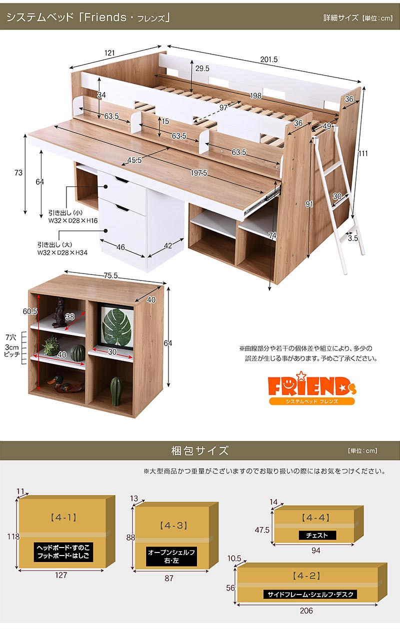 | 梱包サイズ | 【4-1(ヘッド・フット、すのこ、はしご)】127×118×11(cm) 【4-2(サイドフレーム)】206×56×10.5(cm) 、【4-3(オープンシェルフ左右)】87×88×13(cm) 【4-4(チェスト)】94×47.5×14(cm) |