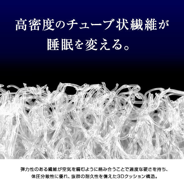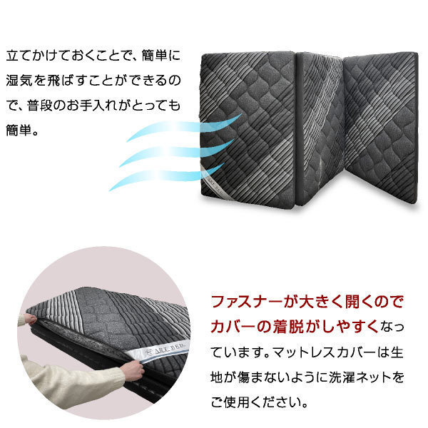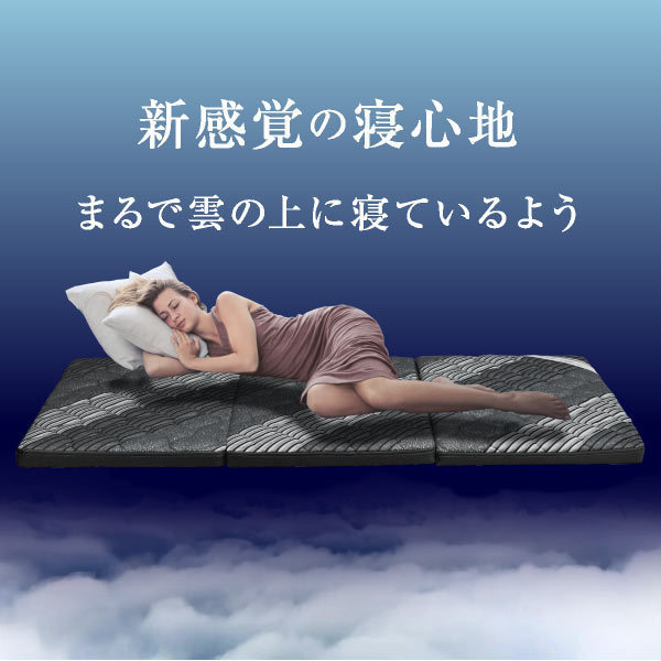 新生活や来客用にもぴったりな三つ折りマットレス。中央がやや硬めで体をしっかり支える体圧分散構造を採用し、快適な寝心地を実現。エアーチューブ構造により通気性・通水性が高く、湿気がこもりにくく年中サラッと快適。リバーシブル仕様で、冬はあたたかく、夏はメッシュ素材で涼しく過ごせます。カバーと中材は丸洗い可能で衛生面も安心。軽量かつコンパクトにたためるため、収納や移動もラクラク。二段ベッドやシステムベッドにも適しており、ご家族全員が安心して使える快眠サポート設計です。