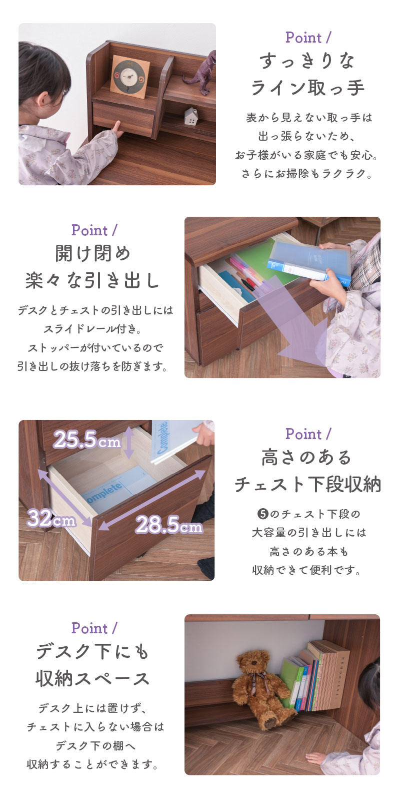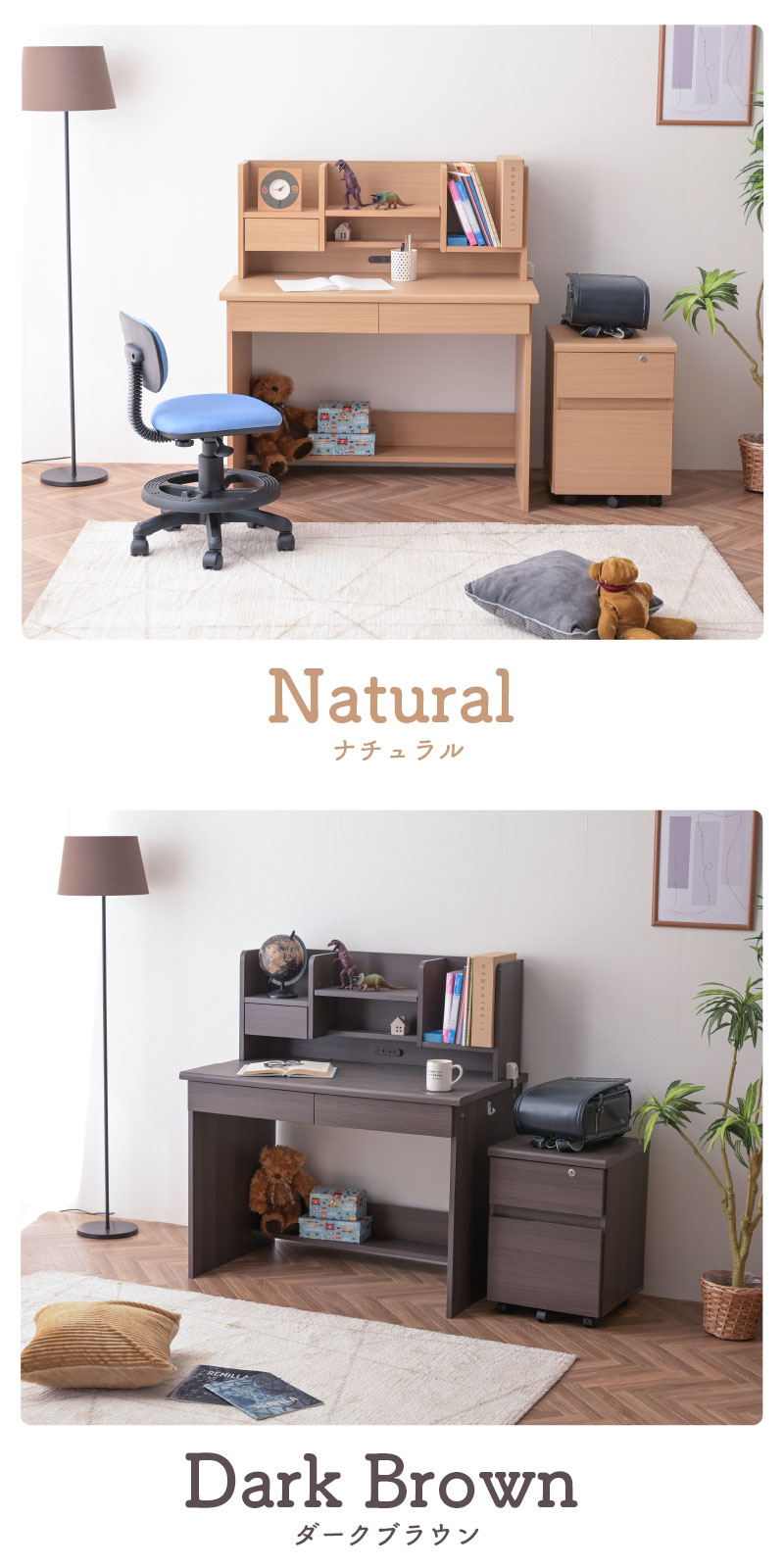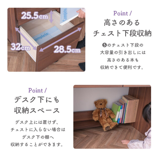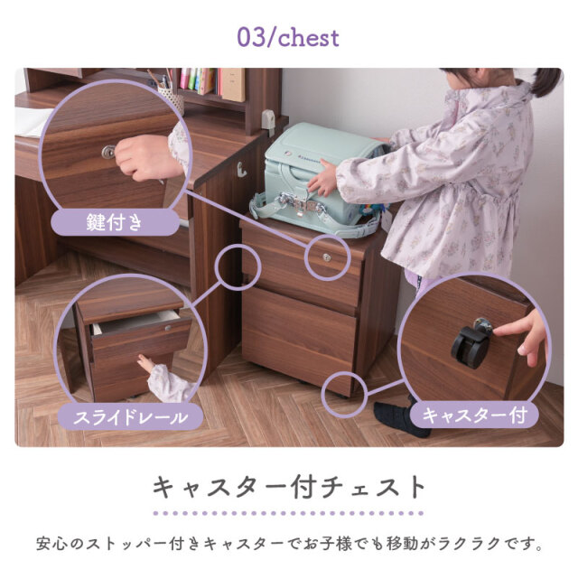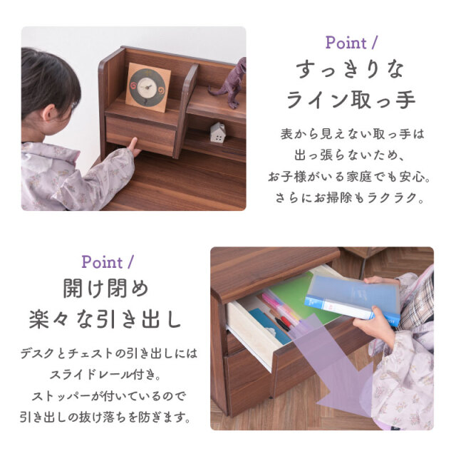 | 特徴 | 【デスク】 ・幅100cmの広々スペース ・角丸仕様でお子様も安心 ・デスク下にも収納スペース 【本棚】 ・3段階可動棚 ・デスクライト置き場 ・2口コンセント 【チェスト】 ・すっきりなライン取っ手 ・ストッパー付きキャスター ・開け閉め楽々なスライドレール ・高さのあるチェスト下段収納 |
