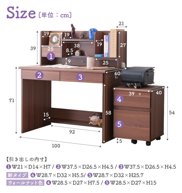 | サイズ(cm) | 【デスク】 幅100×奥行き60×高さ71 【本棚】 幅100×奥行き60×高さ38.5(板厚1.8cm) ※可動棚のダボ間ピッチは3.2 【チェスト】 幅38.5×奥行き39.5×高さ54 【引き出しの内寸】 (本棚)幅21×奥行き13.5×高さ7.5 (デスク左)幅38×奥行き32×高さ5 (デスク右)幅38×奥行き32×高さ5 (チェスト上段)幅28.5×奥行き32×高さ5.5 (チェスト下段)幅28.5×奥行き32×高さ25.5 |