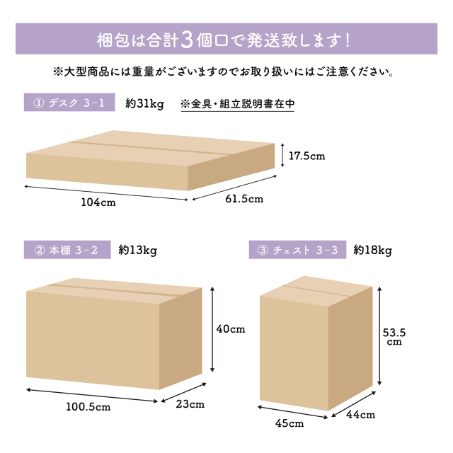 【デスク】幅104×奥行き61.5×高さ17.5(約31kg) 【本棚】幅100.5×奥行き23×高さ40(約13kg) 【旧チェスト】幅51×奥行き42×高さ22(約18kg) 【新チェスト】幅45×奥行き44×高さ53.5 ※新タイプの梱包サイズに順次切り替えてまいります。 |