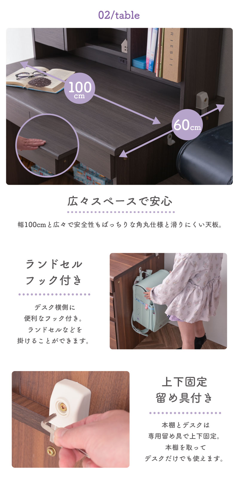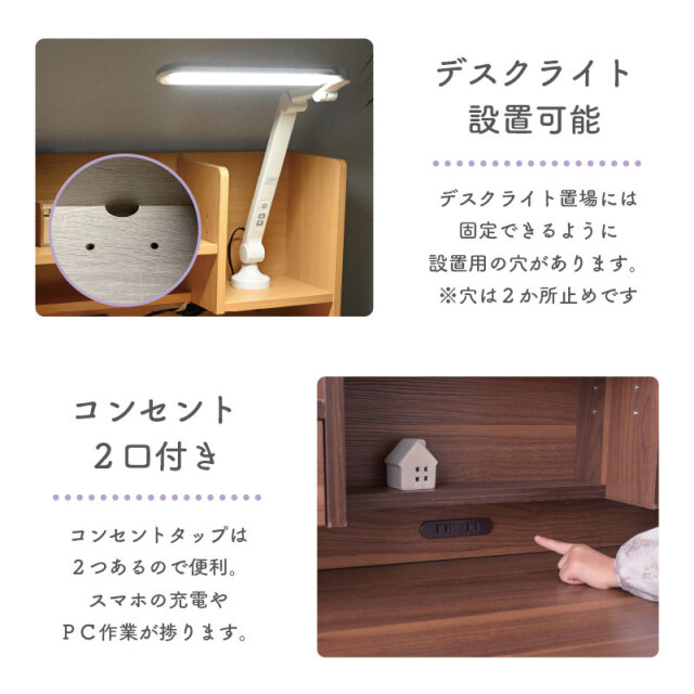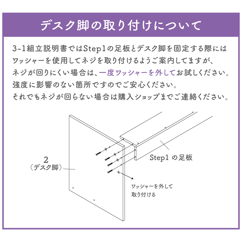 | 補足・注意 | 【お客様組み立て】 ・画像にある学習椅子、デスクライト、小物は付属していません。 ・配送時に埃がつくことがございます。組立時に柔らかい布で乾拭きしてください。 ・デスク脚の取り付けについて組立説明書ではワッシャーを使用してネジを取り付けるようご案内していますが、ネジが回りにくい場合は、一度ワッシャーを外してお試しください。 ・実物に近い状態で撮影していますが、撮影時の光の加減やお客様のPC設定により若干の色合いが異なる場合がございます。 ・曲線部分や若干の個体差により、多少の誤差が生じることがございます。 ・旧タイプのレビューも含まれています。 ・商品は予告なく仕様が変更される場合があります。ご了承ください。 |