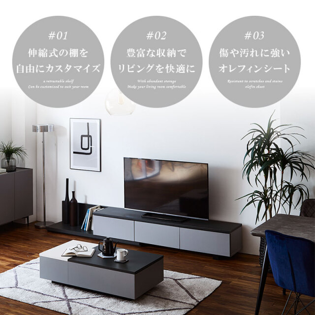 | 特徴 | ・上品でモダン、シンプルなデザインでありながら収納力が抜群の国産センターテーブル ・伸縮式だから好みの長さにでき、お部屋に合わせてカスタマイズできる ・最大300cmまで伸縮可能で狭いお部屋から広々リビングまで幅広く対応 ・3つの引出し収納は大容量で開閉もスムーズなフルスライドレールを採用 ・高い耐久性と耐熱性が特徴で表面強度が高いオレフィンシートを使用 |