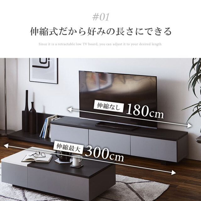 ■サイズ 【伸縮なし】幅179.8×奥行41×高さ34(cm) 【伸縮最長】幅300×奥行41×高さ34(cm) ■製造国 日本 ■カラー グレー ・実物に近い状態で撮影していますが、撮影時の光の加減やお客様のPC設定により若干の色合いが異なる場合がございます。 ・曲線部分や若干の個体差により、多少の誤差が生じることがございます。予めご了承ください。 【送料について】 ・送料無料 ただし、東北、北海道、沖縄・離島へのお届けにつきましては送料無料対象の場合も追加送料が必要となります。 また、開梱設置サービスをご利用の場合、送料とは別に料金が必要です。ご注文前にお問い合せください。 追加料金が必要な場合、買い物カゴでは再計算されません。料金確定後、こちらからご連絡させていただきます。 32インチ 42インチ 50インチ 180cm 180 300cm 300 モノクロ カラー グレー 傷に強い 耐久性 耐熱 丈夫 フルスライドレール モダン おしゃれ おすすめ 人気