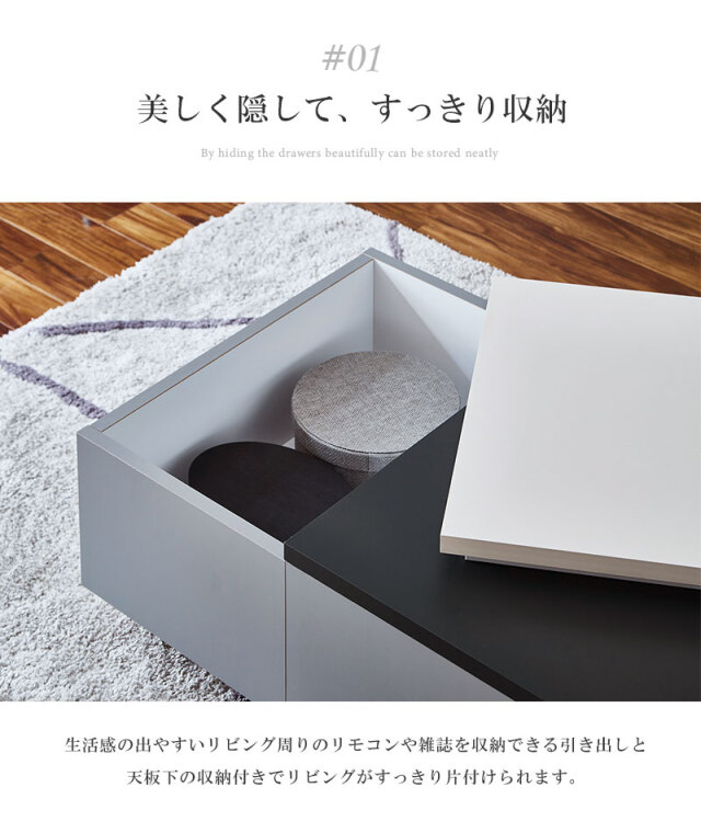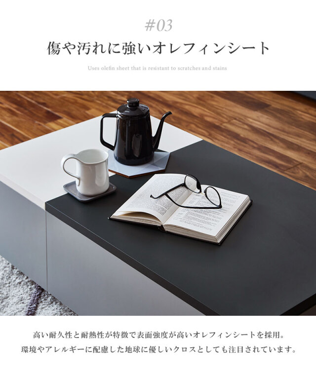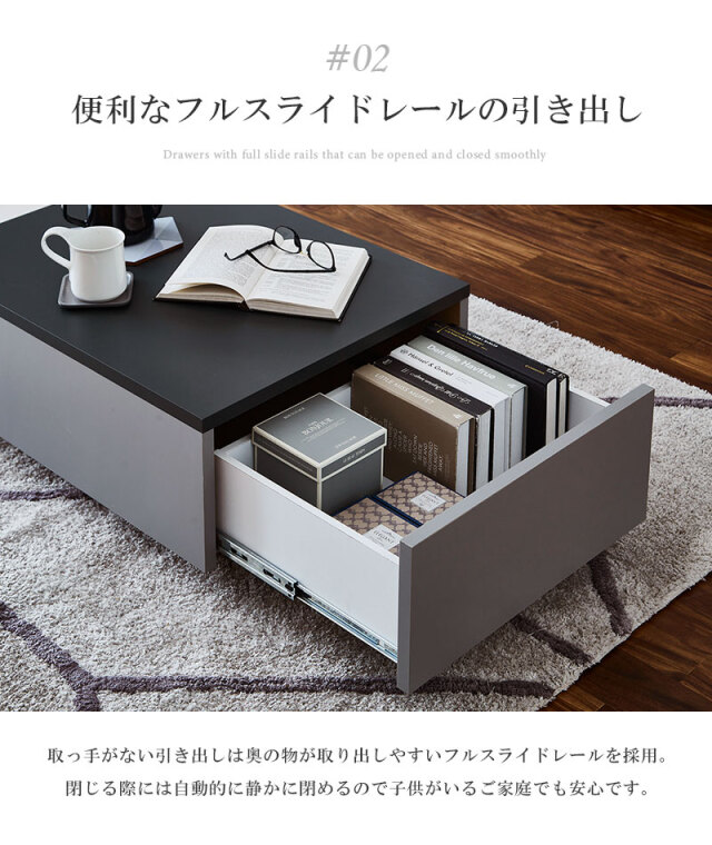 | 特徴 | ・上品でモダン、シンプルなデザインでありながら機能性が抜群の国産センターテーブル ・生活感の出やすいリビング周りのリモコンや雑誌が収納出来る引き出しと天板下の収納付きですっきり片付けられる ・取っ手がない引き出しは奥のものが取り出しやすいフルスライドレールを採用 ・高い耐久性と耐熱性が特徴で表面強度が高いオレフィンシートを使用 |